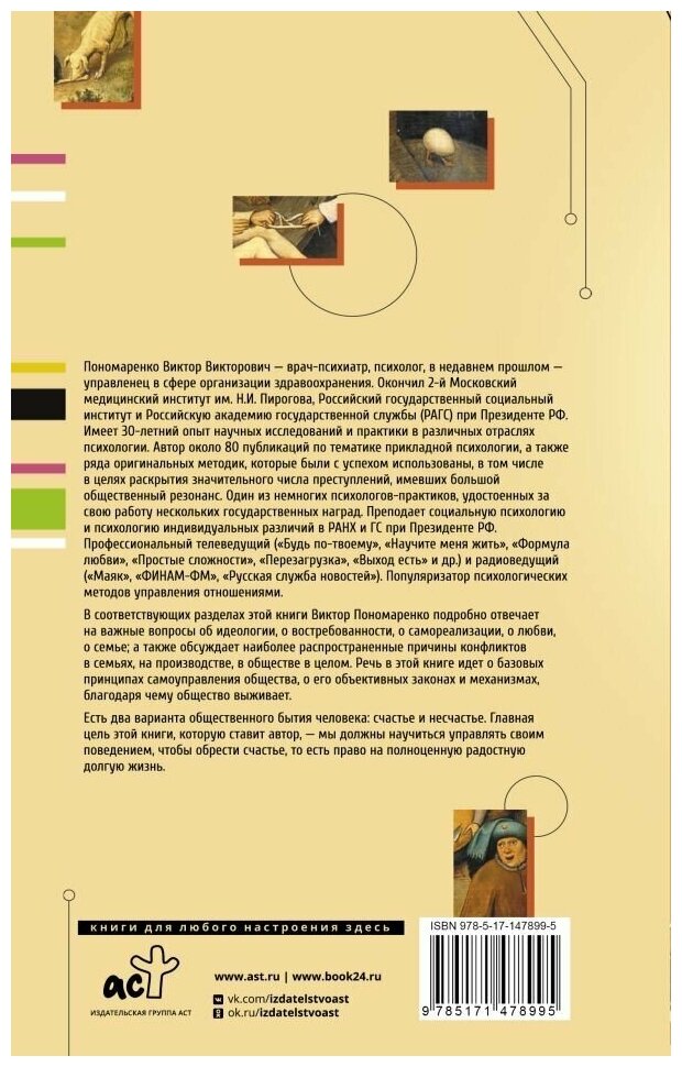 В соответствующих разделах книги «Счастливы не только дураки : как разобраться в людях и в себе. Механизмы поведения» Виктора Пономаренко есть подробные ответы на важные вопросы об идеологии, о востребованности, о самореализации, о любви, о семье; а также обсуждения о наиболее распространенных причинах конфликтов в семьях, на производстве, в обществе в целом. Речь в этой книге идет о базовых принципах самоуправления общества, о его объективных законах и механизмах, благодаря чему общество выживает.