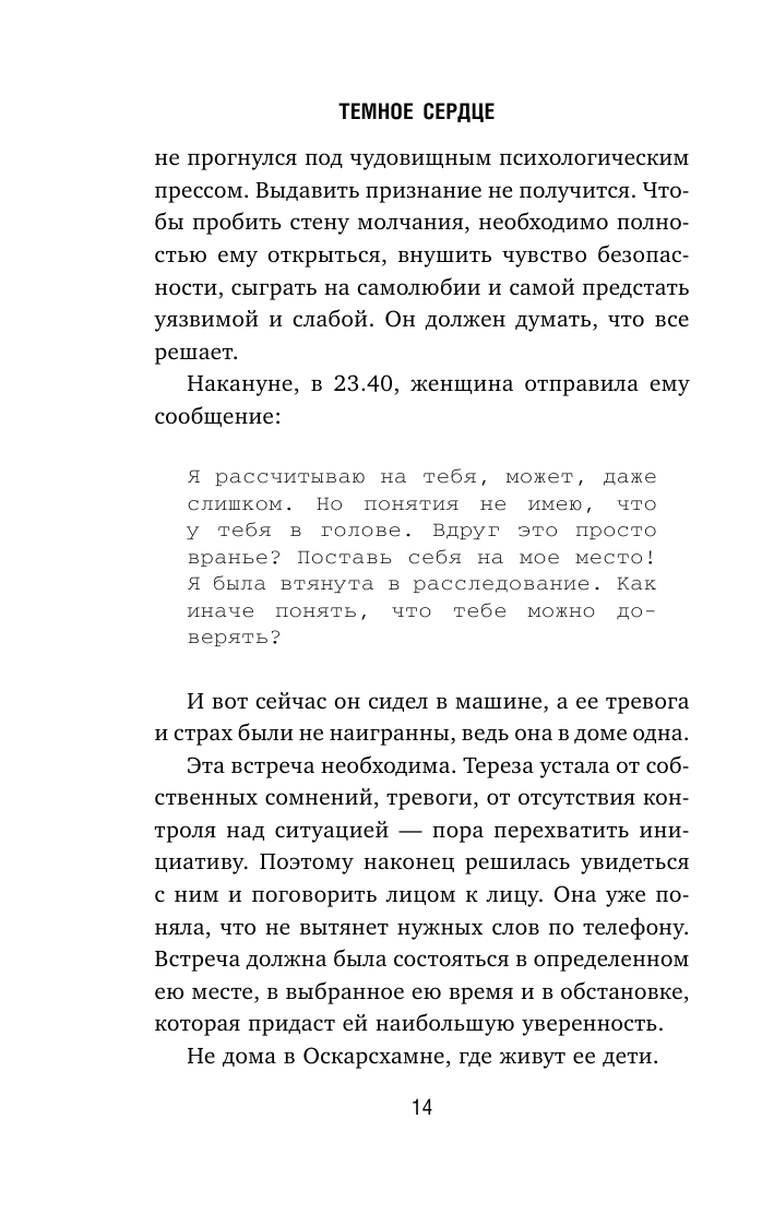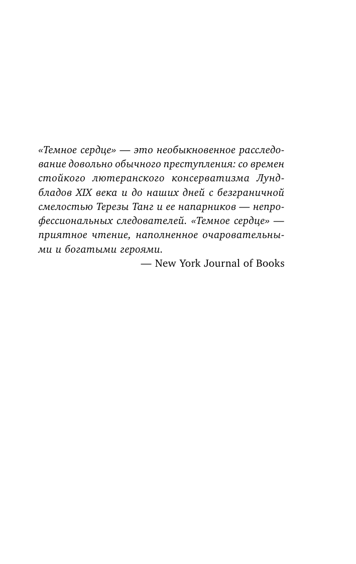 Книга "Темное сердце. Убийство, которое не считали преступлением" - увлекательный триллер с запутанным сюжетом. Автор создал напряженную историю, полную неожиданных поворотов и загадок. Главные персонажи хорошо проработаны, а описания сцен и обстановки позволяют вообразить себя внутри происходящего. Некоторые моменты замедляют темп чтения, но в целом книга доставляет удовлетворение и рекомендуется любителям триллеров.