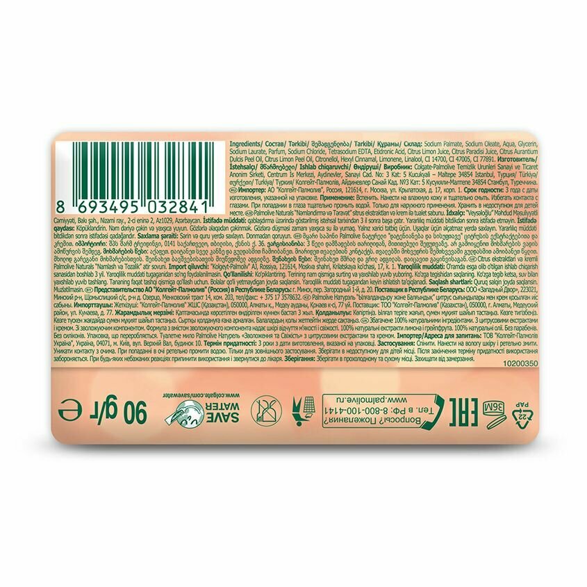 | Химический состав | Sodium Palmate, Sodium Oleate, Aqua, Glycerin, Sodium Laurate, Parfum, Sodium Chloride, Tetrasodium EDTA, Etidronic Acid, Citrus Limon Juice, Citrus Paradisi Juice, Citrus Aurantium Dulcis Peel Oil, Citrus Limon Peel Oil, Citronellol, Hexyl Cinnamal, Limonene, Linalool, CI 14700, CI 47005, CI 77891. |