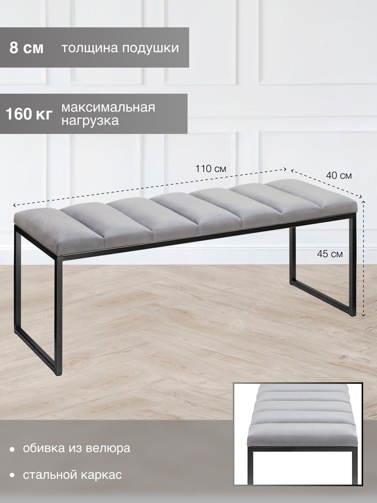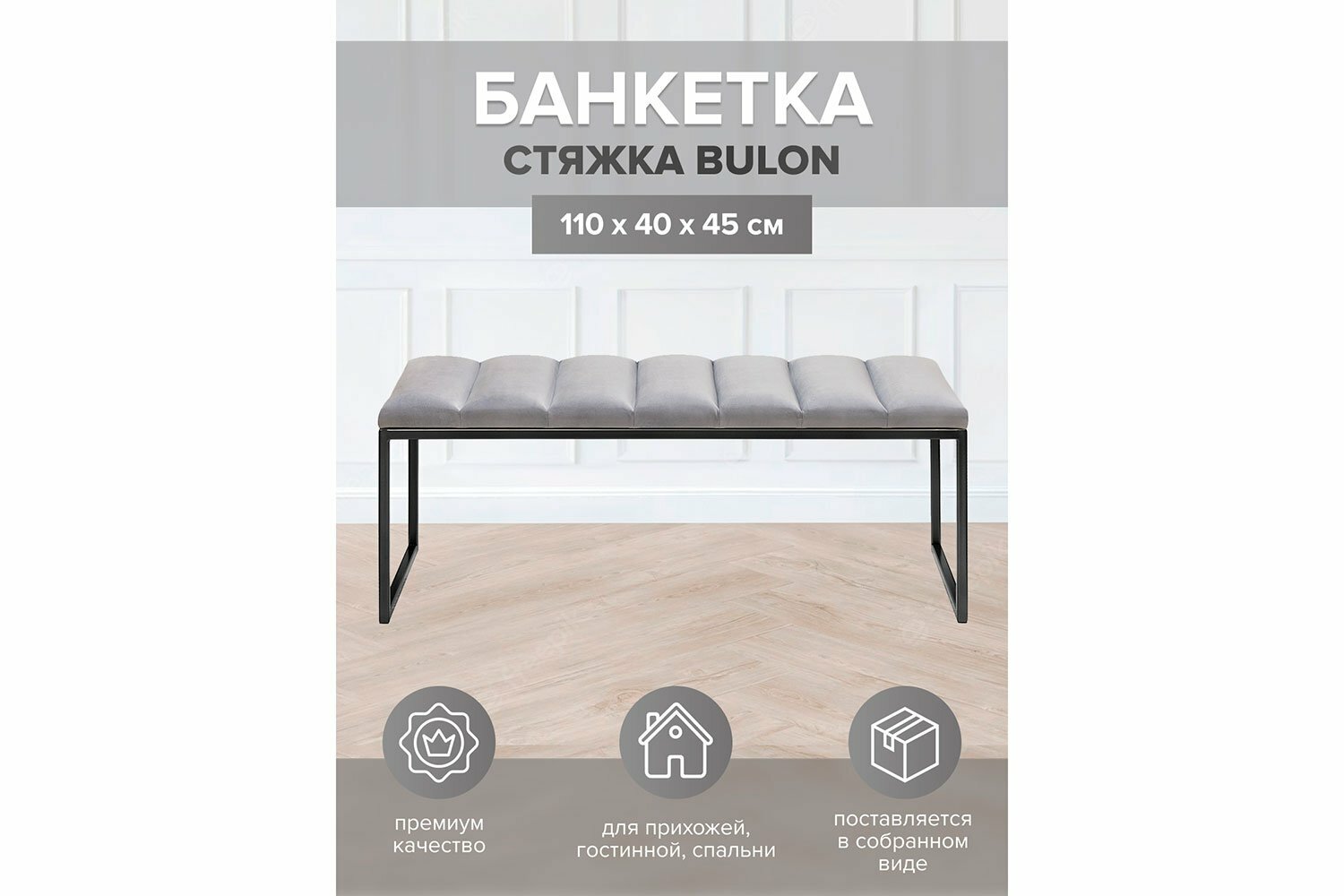 Банкетка ALBA с черным основанием и мягкой велюровой подушкой со стяжкой Bulon. Характеристики банкетки ALBA:• размеры: (длина х ширина х высота) 1100 х 400 х 450 мм,• вес – 9,6 кг,• высота подушки — 80 мм,• обивка — искусственный велюр, • наполнитель — пенополиуретан,• максимальная нагрузка — 120 кг.Основание банкетки изготовлено из стали с полимерным покрытием. Собственное производство обеспечивает надежность и эстетику сварных швов металлической мебели.Банкетка с велюровой подушкой отличается элегантным видом и комфортной посадкой. Мягкая обивка с высокой износостойкостью, прошла тест Мартиндейла — 35 000 циклов.Бархатистая ткань легко чистится от загрязнений, для ухода разрешена сухая и влажная чистка. Стильная банкетка подойдет для прихожей, спальни, гостиной и кабинета.Банкетка лофт добавит изысканности интерьеру квартиры, офиса, салона и загородного дома. Банкетка отлично сочетается со стеллажами KARIN и пуфами OMEGA.Банкетку доставляем в собранном виде в надежной упаковке.