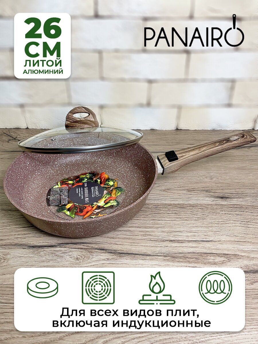 Жарим до румяной корочки!Характеристики:● Благодаря большому диаметру (24 см по верхнему краю) в ней удобно перемешивать.● Сковорода глубокая за счёт высоких стенок, а их большая толщина лучше распределяет тепло, позволяет использовать разные температурные режимы с наибольшим эффектом и предотвращает попадание частичек еды за пределы сковороды. Это позволит надолго сохранить чистоту Вашей кухни.● В комплект входит стеклянная, жаропрочная, точно подходящая по размеру к сковороде крышка. Для правильной циркуляции воздуха на ней есть паровыпускное отверстие. На крышке тактильно приятная ручка из бакелита с покрытием Soft-touch, она абсолютно безопасна: не выделяет вредных веществ при нагревании.● Толщина дна составляет 5 мм – это толщина премиум-класса, в то время как на рынке посуды средняя толщина 2-3 мм! Это исключает деформацию корпуса сковороды, гарантирует ее долговечность, идеально распределяет нагрев по всей поверхности, обеспечивая длительное сохранение тепла, благодаря чему еда не пригорает и равномерно прожаривается.● Сковорода изготовлена из литого алюминия. Вообще существует три способа производства посуды: литой, кованый и штампованный, лучший из которых на сегодняшний день - литой; только таким методом производят толщину премиум-класса! Это говорит о том, что сковорода прослужит долгое время, гарантируя прочность и качество● Безопасное, пятислойное усиленное антипригарное покрытие, нанесенное способом напыления, во много раз лучше, чем покрытия по методу «наката», оно сохраняет антипригарные свойства на долгие годы и не выделяет вредных веществ. Посуда, произведенная технологией напыления, служит намного дольше.● Съемную ручку нового дизайна из бакелита с покрытием Soft-touch тактильно приятно и удобно держать в руке. Благодаря свойствам бакелита в процессе приготовления пищи она не нагревается, отличается устойчивостью к износу, и, что очень важно, - ручка абсолютно безопасна для человека: не выделяет вредных веществ.● Любите готовить в духовом шкафу? Легким движением руки снимите ручку со сковороды, и она превратится в удобную посуду для запекания!● Сковороду можно мыть в режиме "ЭКО" в посудомоечной машине.● Подходит для всех типов плит, включая индукционные.● Терракотовый трендовый цвет будет стильно и оригинально смотреться на фоне Вашего интерьера.