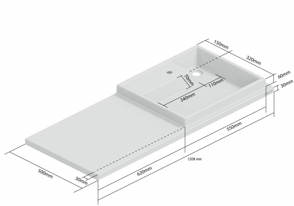 | Дополнительная информация | Максимально возможная глубина стиральной машины 50 см. В случае если умывальник будет устанавливаться без тумбы — необходимо приобретать комплект кронштейнов (правый и левый). Если умывальник приобретается в комплекте с тумбой, то к правосторонним умывальником приобретается левый кронштейн, к левосторонним умывальником — правый кронштейн. |