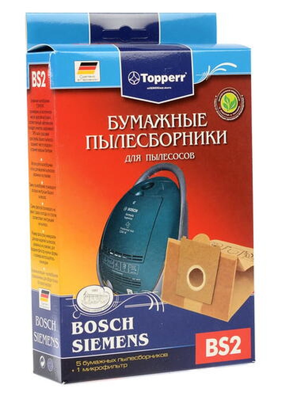 | Прочие особенности и свойства | Бумажные пылесборники BS2 для пылесосов BOSCH и SIEMENS изготовлены из экологически чистой двухслойной бумаги, соответствующей европейскому стандарту качества, задерживают 99% пыли, продлевая срок службы пылесоса, сохраняют чистоту воздуха и устраняют вредные бактерии.,,BOSCH:Home Professional BSGL 5 PRO.; Free`e BSGL 52...; GL-30 BSGL 3....; GL-40 BSGL 4....; Formula Hygienixx BSG 7…..; Logo BSG 6….; Sphera BSA 2…, BSA 3…, BSD2..., BSD 3...; Move BSGL 2move (1-8); Perfecta Ultra BSF 1...; Casa BSD 1...; Natura BSD 2...; Easy Control BSC 1...; Perfecta BBS 8...; Compacta BBS 7...; Activa BBS 6...; Optima BBS 5...; Maxima BBS 4...; Alpha1 BBS 1..., Alpha2 BBS 2...; Solida BBS 1...; Solitaire BSA 2.,,SIEMENS:Z3.0 VSZ3....; Z4.0 VSZ 4....; Z5.0 VSZ5....; Z6.0 VSZ 6....; Technopower VS 07G....; Synchropower VS 06G....; Dino VS 5.A(B)(C)(E)..; VS 04G....; SuperL(XL) VS 9.A..; VS 81A..; SuperE VS 7.A(B)(C)(D).., VS 33A(B)..; VS 32A(B)..; Super700 VS 7....; Super690 VS 69...; SuperM VS 6.A.., VS 7.C(D)..; Super500 VS 5....; SuperS VS 42A(B).., 44A(B)..; Super100 VS10...; Super XS(XXS) VS5.A(B)..; SuperC VS63A.,,В упаковке |