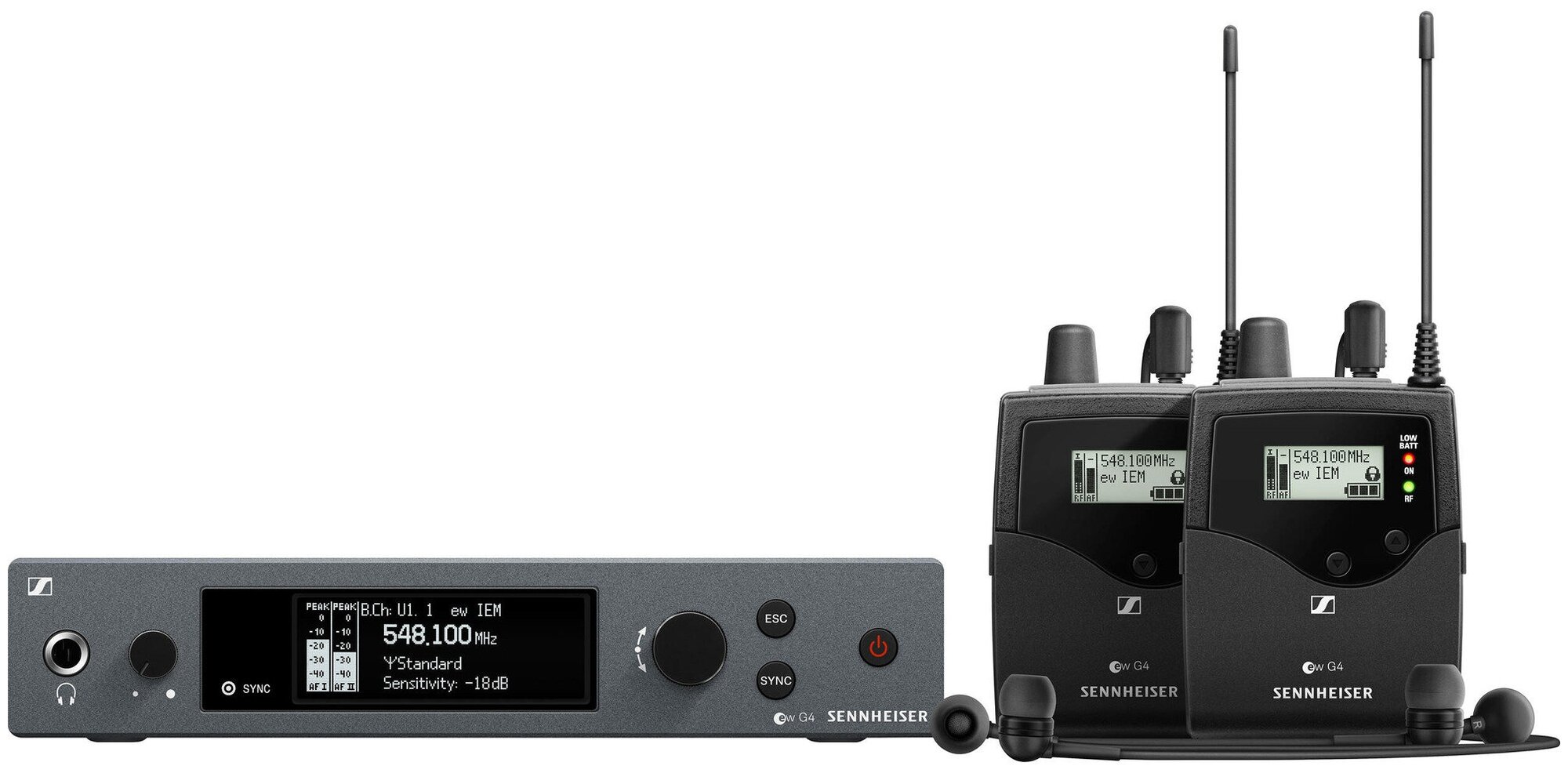 - Состоит из двух поясных приемников EK IEM G4, передатчика SR IEM G4 в полурэковом корпусе и двух пар внутриканальных наушников IE 4