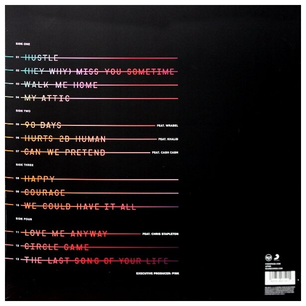 Издание на двойном виниле.. 8-й студийный альбом международной поп-звезды увидит свет 26 апреля!. Легендарная и потрясающая суперзвезда P!NK подтвердила дату выхода нового альбома: пластинка «Hurts 2B Human» увидит свет уже 26 апреля. Вслед за приятными новостями о выходе своей 8-й студийной работы знаменитая певица также представила и новый сингл «Hustle». Этот заводной и энергичный трек был написан P!NK в соавторстве с Йоргеном Одегардом и Дэном Рейнолдсом из Imagine Dragons и спродюсирован ими же. Для своего нового 13-трекового блокбастера P!NK решила объединить силы со старыми и новыми друзьями: среди гостевых исполнителей и продюсеров можно встретить такие имена, как Макс Мартин, Shellback, Грег Керсти, Бэк и Сиа — а также многих, многих других. Первый сингл с альбома «Walk Me Home» к настоящему моменту собрал свыше 50 миллионов стримов по всему миру, занимая место в американском топ-10 iTunes. Клип на эту работу, снятый режиссером «Величайшего шоумена» Майклом Грейси, набрал почти 7 миллионов просмотров со времен своего релиза на прошлой неделе. Со времен своего дебюта в 2000 году P!NK успела выпустить 7 студийных альбомов и 1 альбом лучших хитов, продать больше 42 млн пластинок и 75 млн синглов по всему свету, а также заполучить 15 синглов в первой десятке чарта Billboard Hot 100 (4 из них — на #1 месте). Также она стала лауреатом трех премий «Грэмми» (20 номинаций), одной Daytime Emmy Award, трех Billboard Music Awards, шести MTV Video Music Awards, двух MTV Europe Awards и двух People’s Choice Awards, а также была названа Женщиной года по версии Billboard в 2013 году. Седьмой студийный альбом поп-звезды «Beautiful Trauma» получил платиновую сертификацию, дебютировав на #1 месте чарта Billboard 200, Продажи альбома первой недели установили рекорд для самой артистки.