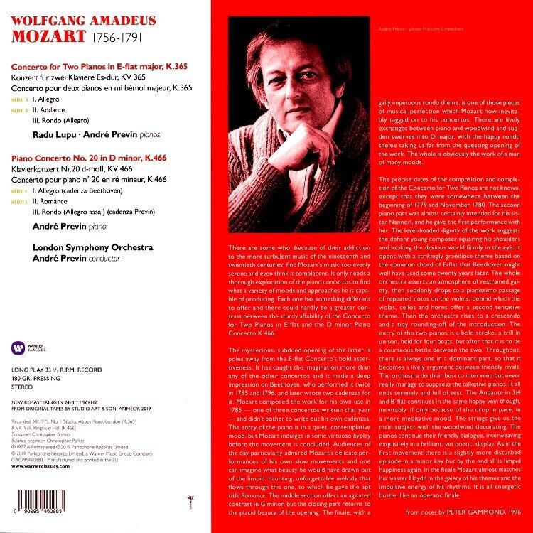 Виниловая пластинка Radu Lupu London Symphony Orchestra / Andre Previn Mozart: Double Concerto Piano Concerto No. 20 (0190295460983) Warner Music Classic