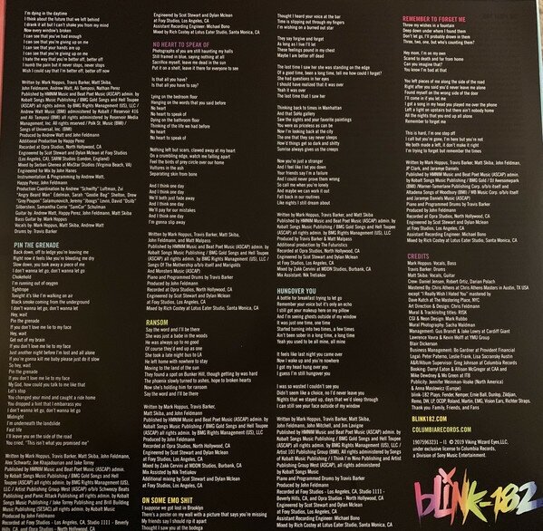 Исполнитель Blink-182Альбом NineГод выхода 2019Год релиза 2019Лейбл ColumbiaФормат LPСостояние NewЖанр RockСтиль Pop PunkЦвет BlackСтрана EUStandard edition in a gatefold sleeve with insert and printed inner sleeve.A1 The First TimeA2 Happy DaysA3 HeavenA4 DarksideA5 Blame It On My YouthA6 Generational DivideA7 Run AwayA8 Black RainB1 I Really Wish I Hated YouB2 Pin The GrenadeB3 No Heart To Speak OfB4 RansomB5 On Some Emo ShitB6 Hungover YouB7 Remember To Forget Me