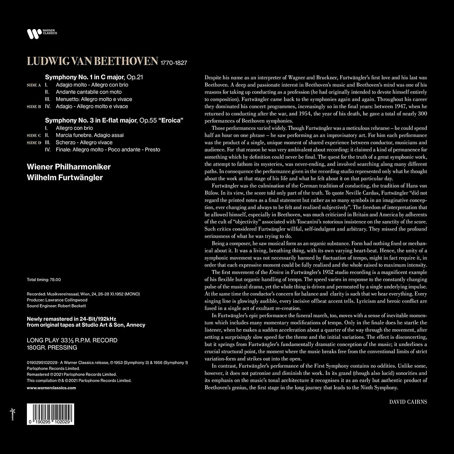 Виниловая пластинка Wilhelm Furtwangler Beethoven: Symphonies Nos. 1 & 3 'Eroica' (Newly Remastered In 24-Bit/192Khz From Original Tapes) (0190295102029) Warner Music Classic