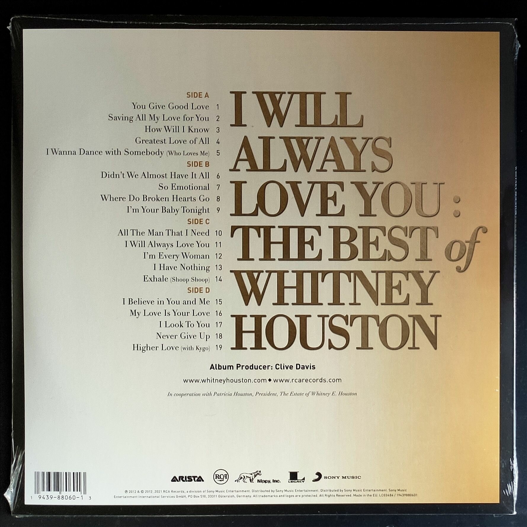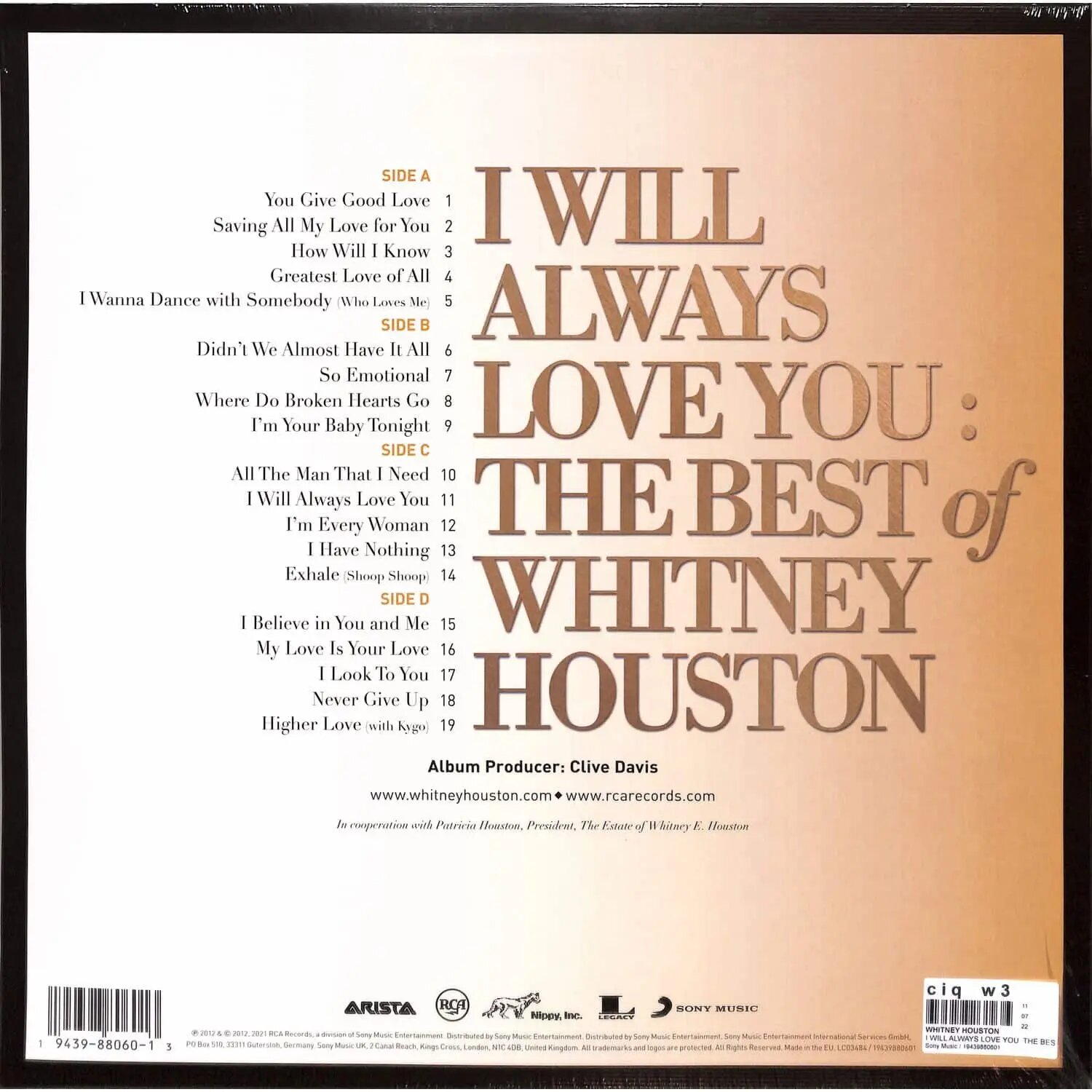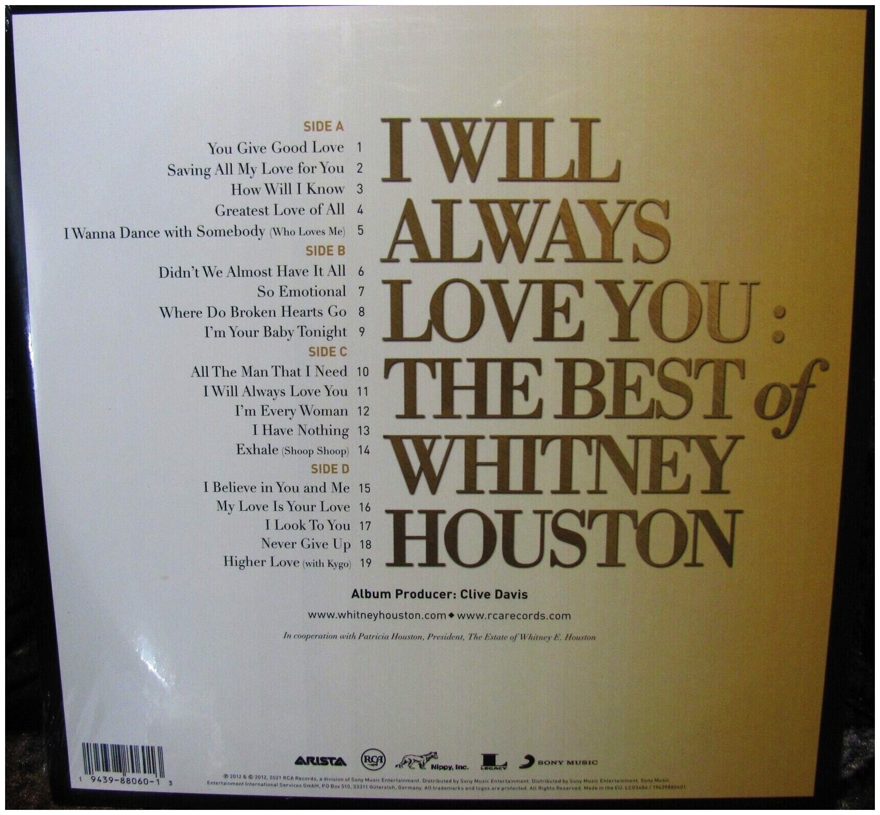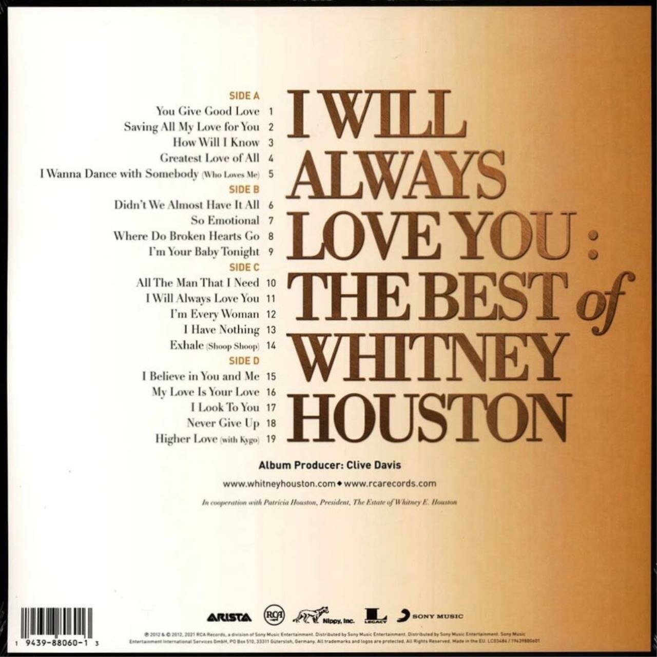 "I Will Always Love You: The Best Of Whitney Houston" - впервые на виниле сборник лучших композиций великой Уитни Хьюстон. В треклист альбома вошло 18 композиций с оригинального сборника 2012 года, а также бонус-трек “Higher Love” от норвежского диджея Kygo.Список композицийПластинка 1:1. A1. You Give Good Love2. A2. Saving All My Love For You3. A3. How Will I Know4. A4. Greatest Love Of All5. A5. I Wanna Dance With Somebody (Who Loves Me)6. B1. Didn’t We Almost Have It All7. B2. So Emotional8. B3. Where Do Broken Hearts Go9. B4. I’m Your Baby TonightПластинка 2:1. C1. All The Man That I Need2. C2. I Will Always Love You3. C3. I’m Every Woman4. C4. I Have Nothing5. C5. Exhale (Shoop Shoop)(from Waiting To Exhale – Original Soundtrack)6. D1. I Believe In You And Me (Record Version)7. D2. My Love Is Your Love (Radio Edit)8. D3. I Look To You9. D4. Never Give Up10. D5. Higher Love (Kygo & Whitney Houston)