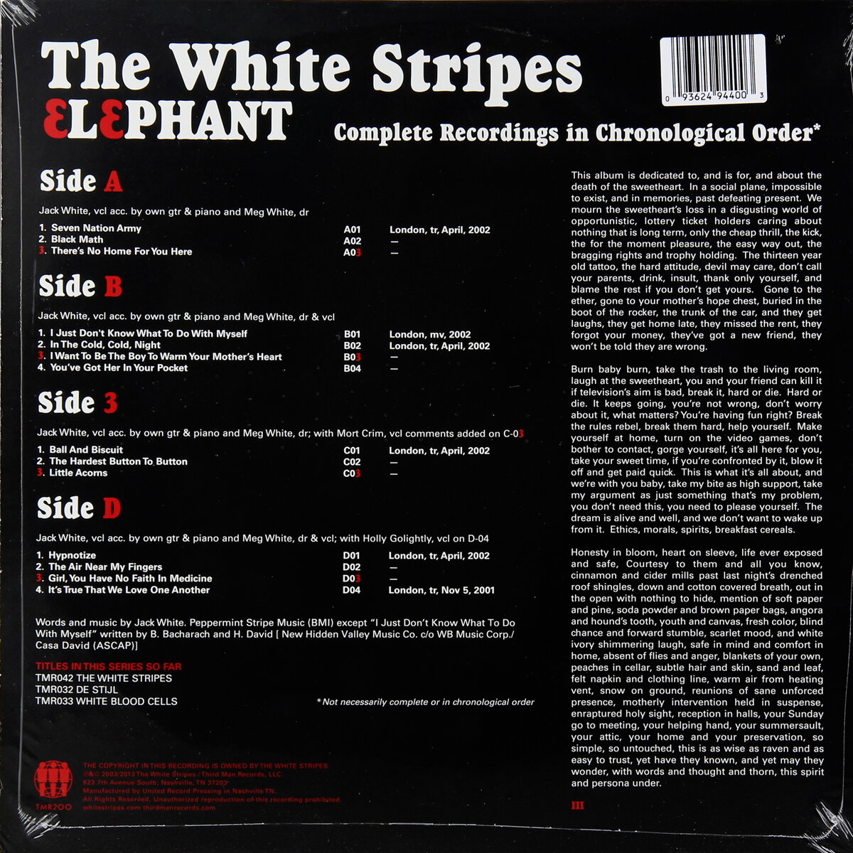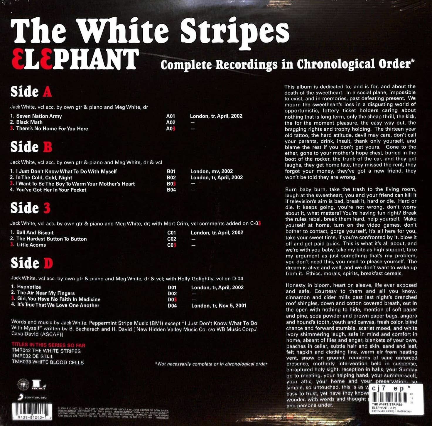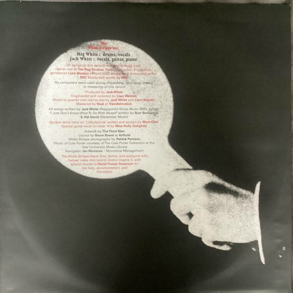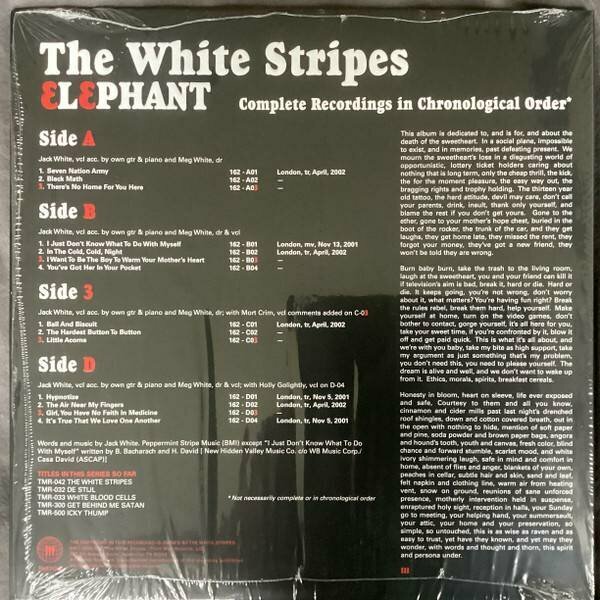 LP 1: A1. Seven Nation ArmyA2. Black MathA3. There's No Home For You HereB1. I Just Don't Know What To Do With MyselfB2. In The Cold, Cold, NightB3. I Want To Be The Boy To Warm Your Mother's HeartB4. You've Got Her In Your PocketLP 2: C1. Ball And BiscuitC2. The Hardest Button To ButtonC3. Little AcornsD1. HypnotizeD2. The Air Near My FingersD3. Girl, You Have No Faith In MedicineD4. It's True That We Love One Another"Elephant" - студийный альбом группы The White Stripes, вышедший в 2003 году. Альбом получил признание большинства музыкальных критиков, а также стал первым большим коммерческим успехом для группы относительно их предыдущих работ. "Elephant" был дважды номинирован на премию "Грэмми" в категориях: "Лучший альбом года" и "Лучший альтернативный альбом" в 2004 году Песня "Seven Nation Army" с этого альбома стала спортивным гимном болельщиков всего мира. Издание на двойном черном виниле в разворотном конверте. The White Stripes - американская рок-группа, образованная в 1997 году в Детройте, штат Мичиган. В состав The White Stripes с самого начала входили лишь два человека: Джек Уайт - гитарист, пианист и вокалист, и Мег Уайт - барабанщица-перкуссионистка, иногда исполняющая бэк-вокал. Изредка в песнях группы используются такие инструменты, как калимба, губная гармошка и банджо. После выпуска нескольких синглов и трёх студийных альбомов преимущественно в пределах музыкальной сцены Детройта The White Stripes стали известными только в 2002 году, как инициаторы возрождения гаражного рока. Такие альбомы как "Elephant" и "White Blood Cells" стали коммерческим успехом для группы, что также вызвало большое внимание со стороны СМИ Соединенных Штатов и Великобритании. Сингл "Seven Nation Army", благодаря своей известной гитарной партии является визитной карточкой группы во всём мире. Группа выпустила ещё два альбома: "Get Behind Me Satan" в 2005 году и "Icky Thump" в 2007-м. После этого, в 2011 году, The White Stripes решили оставить музыкальную деятельность на неопределённый срок. Музыка "белых полос" является комбинацией гаражного рока с блюзом, имея при этом «сырую» простоту аранжировок и компоновок. Дуэт был также известен своим эстетическим дизайном, объединявшего простую цветовую схему из белых, красных и чёрных оттенков, которые также были использованы при художественном оформлении всех студийных альбомов и синглов группы. Дискография The White Stripes состоит из шести студийных альбомов, одного концертного альбома, двух мини-альбомов, двадцати шести синглов, четырнадцати музыкальных клипов и одного DVD-диска с записями концертов. Каждый из трёх последних альбомов группы получал премию Грэмми в номинации "Лучший альтернативный альбом".
