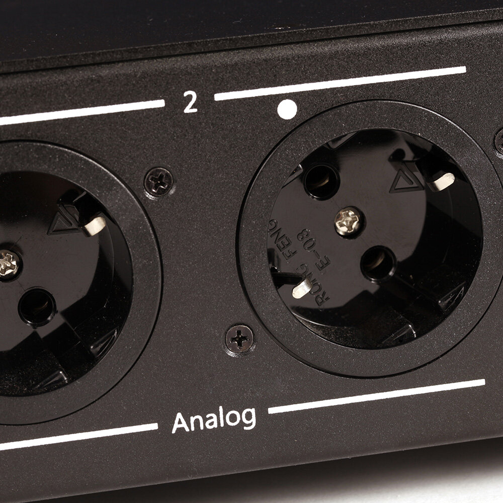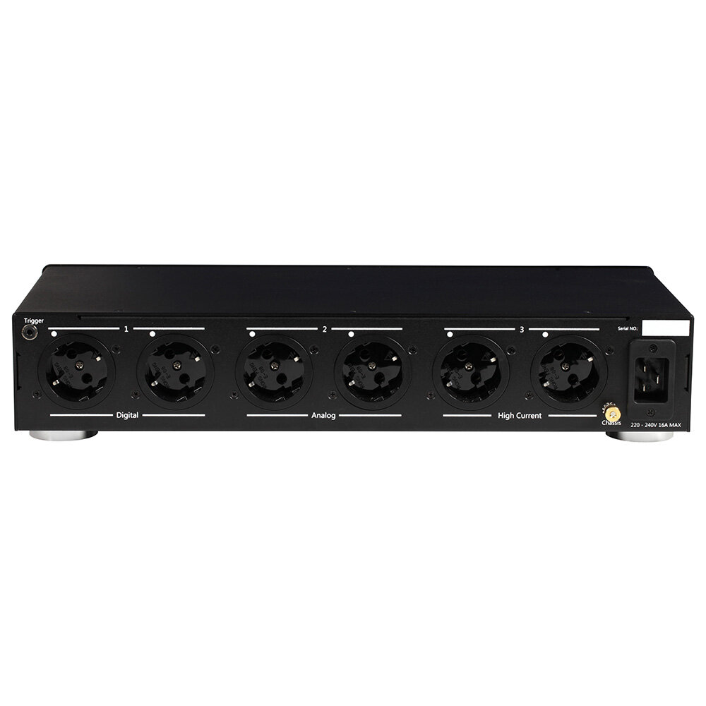 Сетевой фильтр-распределитель для AV-компонентов на 6 розеток в металлическом корпусе, группы для аналоговых и цифровых компонентов, максимальный ток 16 А, габариты 440 х 80 х 185 мм, вес 4,8 кг.