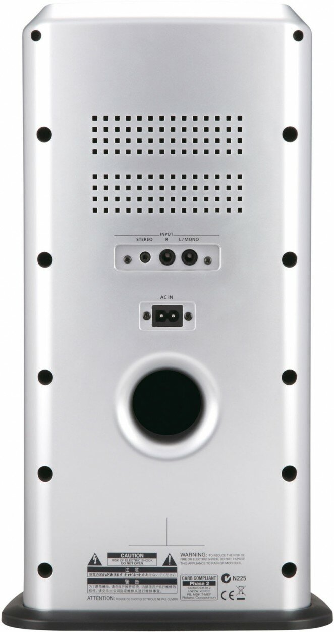 За воспроизведение звука отвечают два широкополосных 3-дюймовых динамика, которые способны передать весь спектр частот и обеспечить стереозвук. Также присутствует отдельный 5-дюймовый вуфер, отвечающий только за НЧ-диапазон. Вместе эти динамики образуют номинальную мощность 30 Вт: 7.5 + 7.5 + 15 Вт соответственно. Таким образом, достигается мощное, громкое и полноценное звучание, а при помощи отдельных регуляторов громкости можно настроить баланс между динамиками. Подключение ударной установки возможно к одному из двух входов, один из которых представлен двумя разъемами 1/4" Jack TS, а другой одним разъемом 1/8" Jack TRS. Это позволяет системе корректно работать с любыми источниками звука. Питание осуществляется от сети, в комплекте поставляется сетевой кабель. Присутствует полезный режим энергосбережения, который включается после 30 минут бездействия.