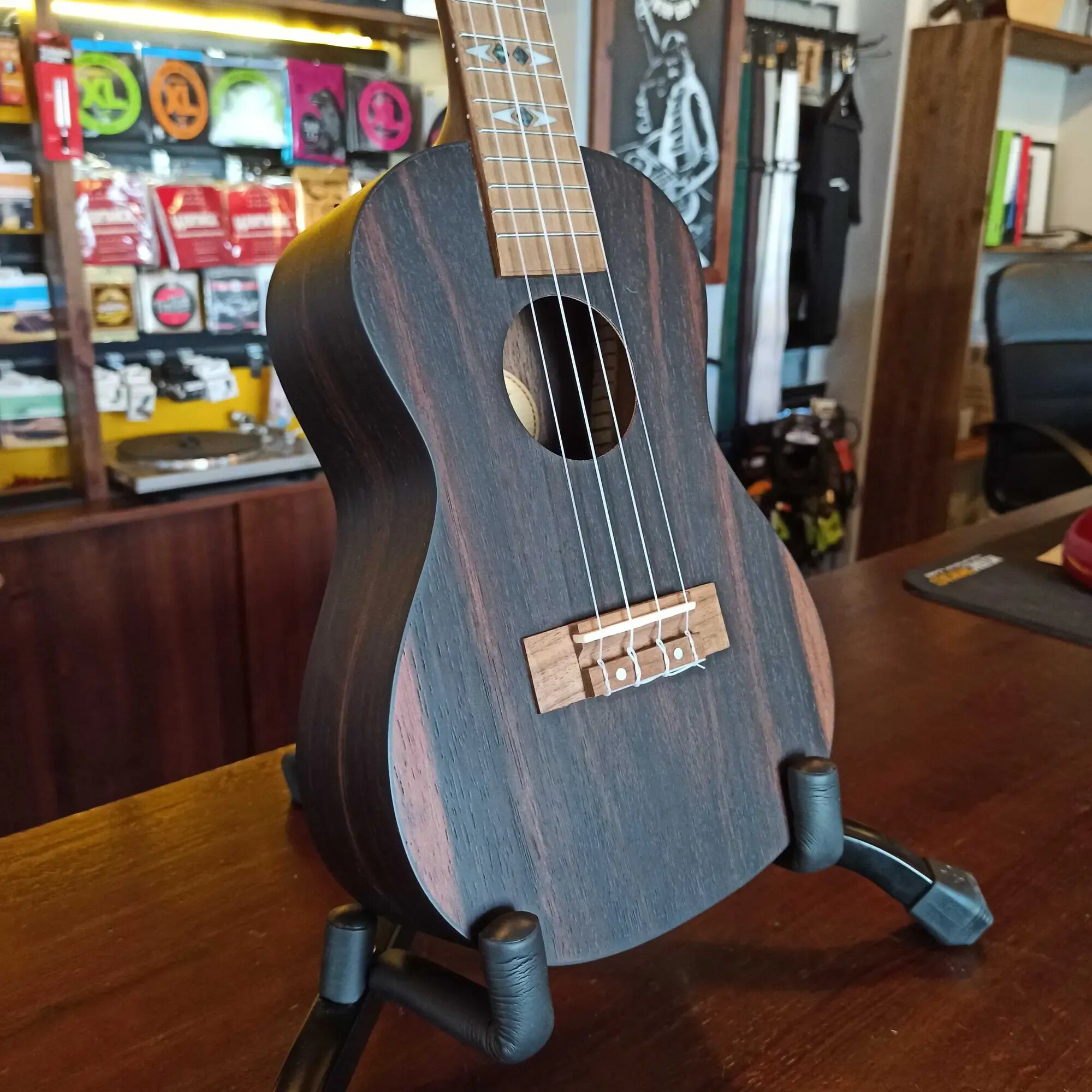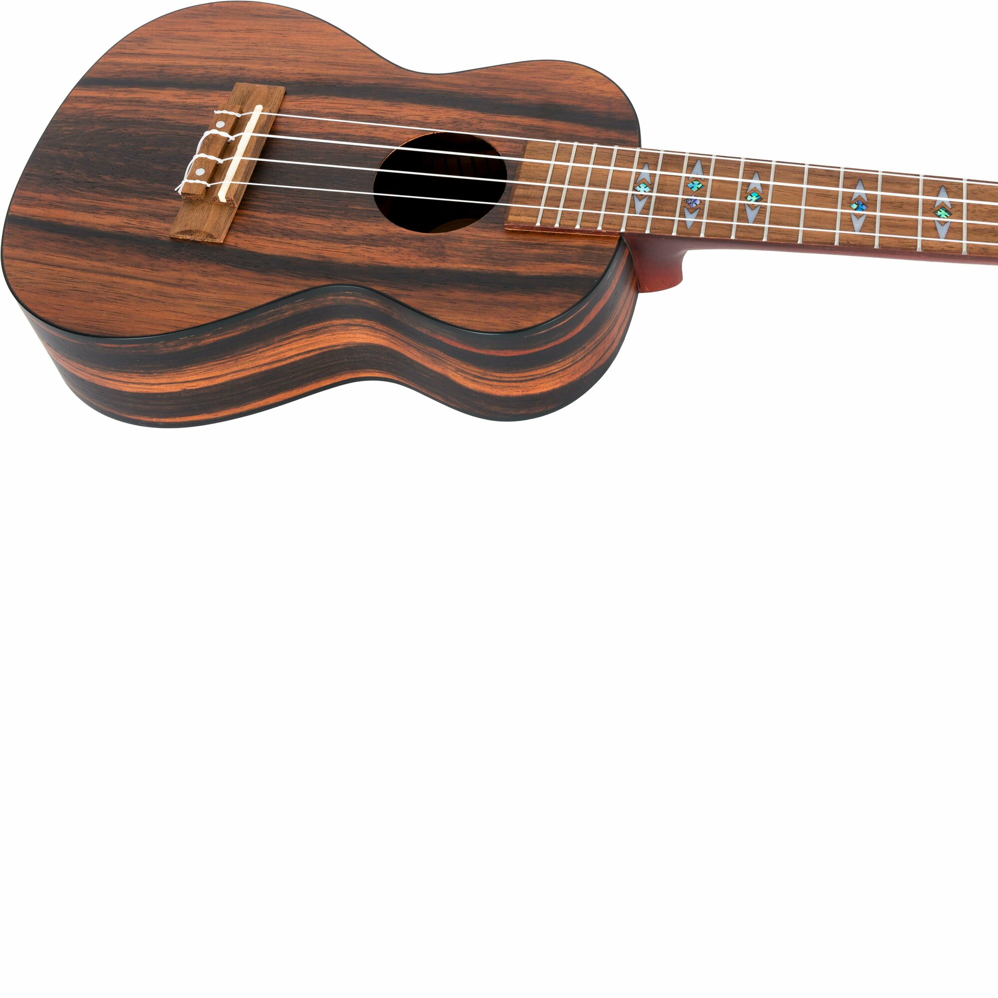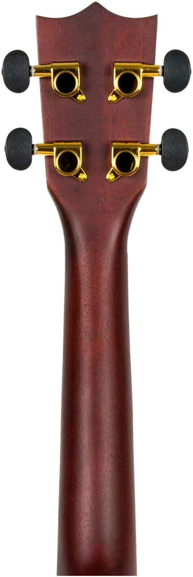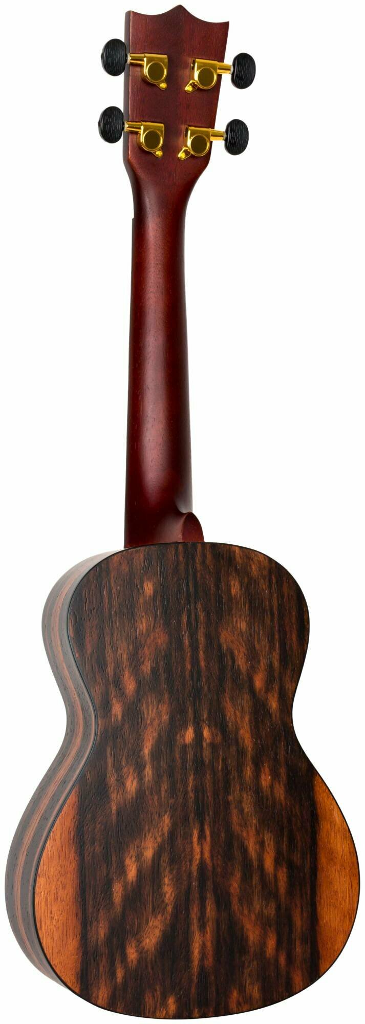 Укулеле в корпусе типа концерт. Топ, нижняя дека и обечайка из древесины амара. Гриф из африканского окуме, накладка и бридж из ореха. 18 ладов, ширина грифа 1.3 дюйма. Костяные верхний и нижний порожки. Литые колки с золотым покрытием, инкрустация розетки. В комплекте поставляется фирменный мягкий чехол.
