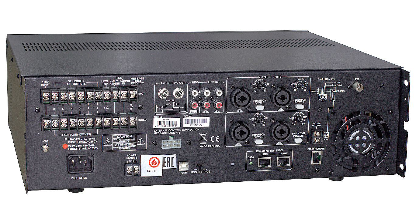 Трансляционный микшер-усилитель на 6 зон с MP3-плеером и FM-тюнером. Мощность 4 ом - 480 Вт, 70/100в - 80 Вт на каждую зону. 6 зон без возможности регулировки уровня громкости в каждой зоне. Встроенный MP3-плеер с поддержкой MMC, micro SD, mini SD, поддерживаемые форматы MP3, WMA, WAV, ACC. 4 микрофонных /линейных входа на комбо-разъемах XLR/Jack, есть регулировка уровня и тембра, фантомное питание 24В. 2 линейных входа на разъемах 2хRCA с регулировкой уровня и тембра. 1 выход для записи 2хRCA. 1 вход для микрофонов PM01 (максимально 3 шт.). 1 вход для микрофонов PM06 (максимально 6 шт.). Разъем для подключения антенны FM диапазона. Размеры: 444 х 367 х 130 мм. Вес 15,9 кг.