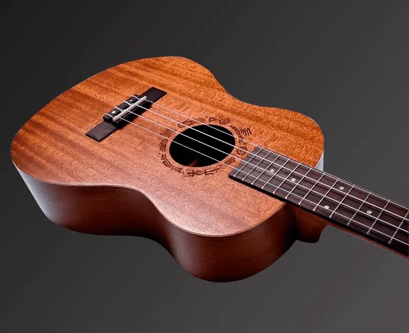 Благодаря увеличенной мензуре укулеле располагает 19 ладами с инкрустацией в виде белых точек. Ширина верхнего порожка достигает 1.49 дюймов. Колки используют механизм открытого типа и прекрасно справляются с нейлоновыми струнами. Наконец, резонаторное отверстие отделано эффектной лазерной гравировкой. Комплектация включает в себя мягкий чехол для транспортировки и хранения инструмента.