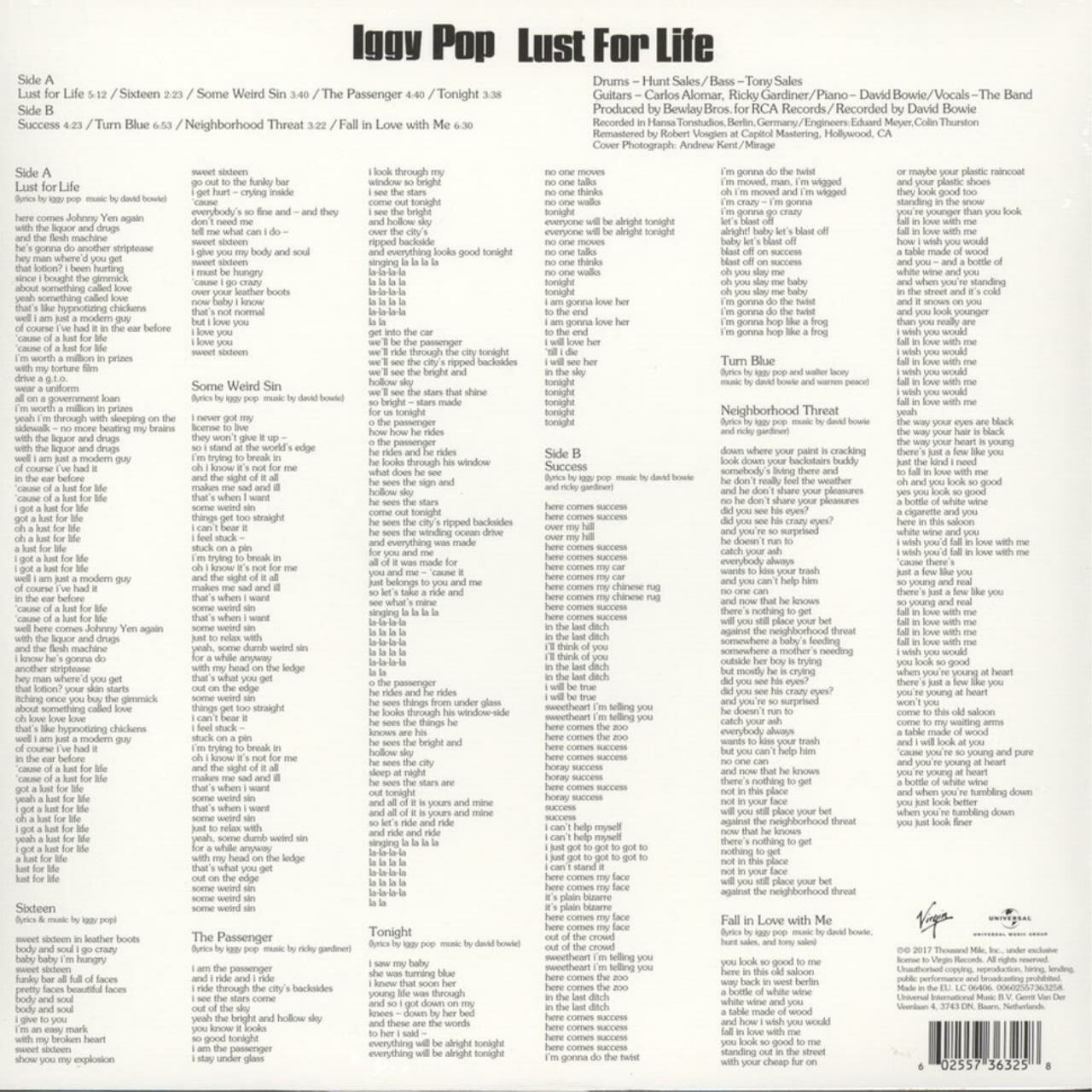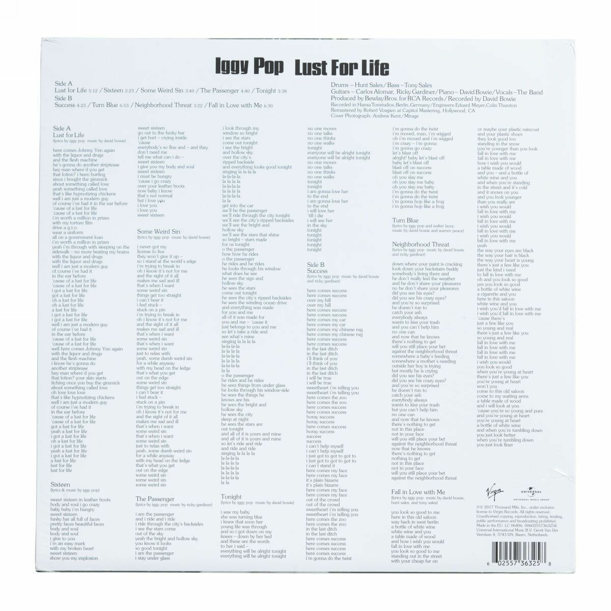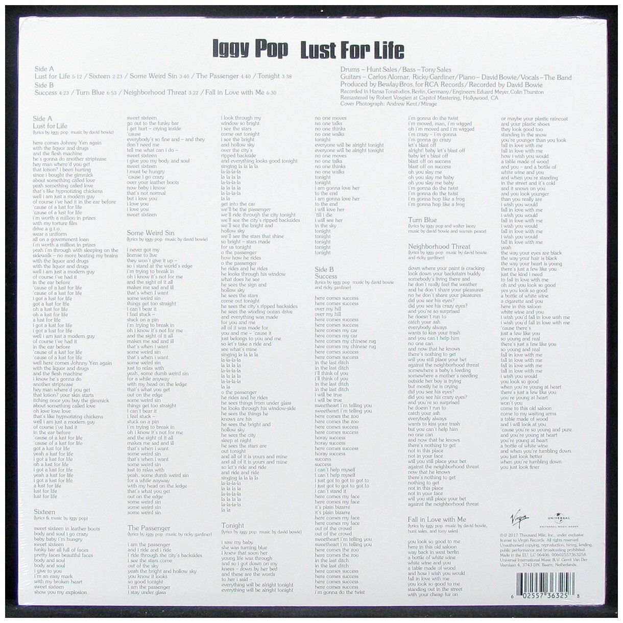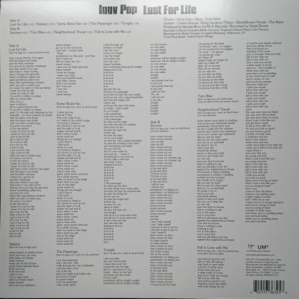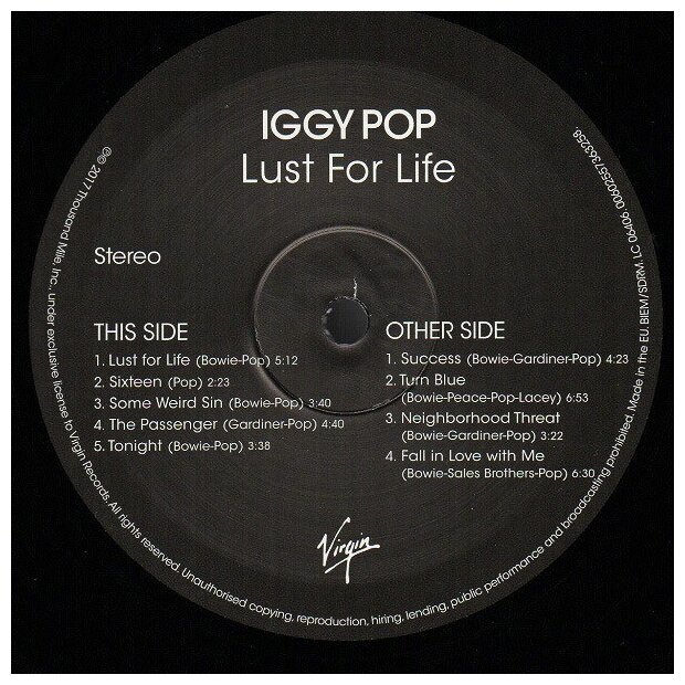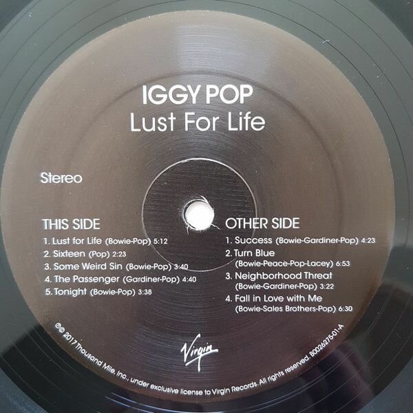 Новая пластинка в заводской пленке "Still Sealed (SS)" - Iggy Pop - Lust For Life (1 LP); Лейбл: Virgin, Universal Music Group Производитель: Record Industry ; Страна производства: Нидерланды ; Комплект: Конверт, виниловая пластинка, графический вкладыш ; Треклист: A1 Lust For Life A2 Sixteen A3 Some Weird Sin A4 The Passenger A5 Tonight B1 Success B2 Turn Blue B3 Neighborhood Threat B4 Fall In Love With Me ; Lust for Life (рус. Жажда Жизни) — второй студийный альбом Игги Попа и его второй диск, записанный в сотрудничестве с Дэвидом Боуи, издан в 1977 году, спустя полгода после пластинки The Idiot. Диск получил положительные отзывы критиков и на сегодняшний день является наиболее коммерчески успешным альбомом музыканта, кроме того, он стал его самым успешным лонгплеем в британском чарте (достиг #28). Заглавная песня получила новый виток популярности два десятилетия спустя, когда попала в саундтрек к кинофильму «На игле» (1996); Баркод: 602557363258