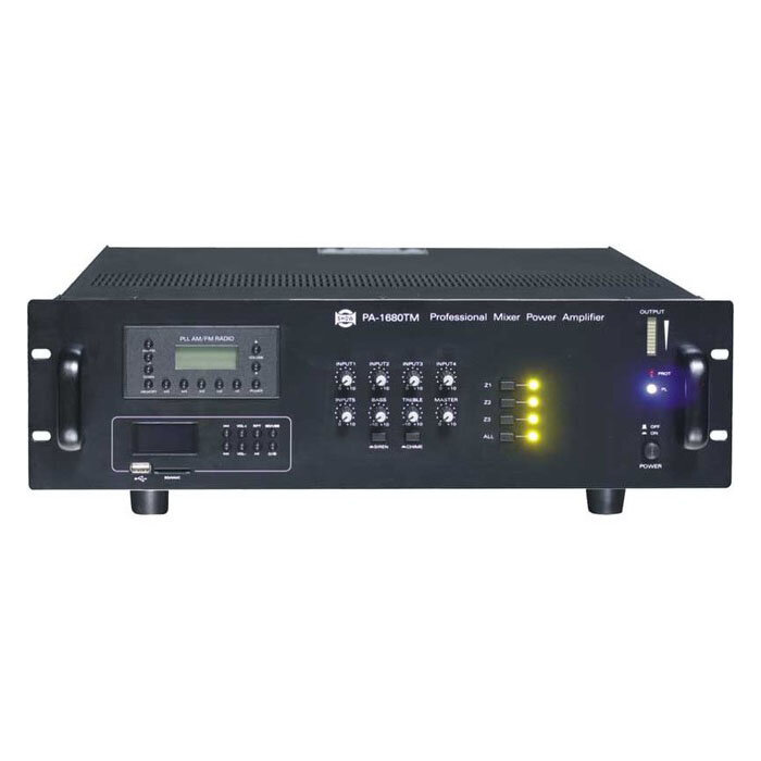 Комбинированный усилитель для трансляции и оповещения. Мощность 680 Ватт (70/100В или 4/8/16 Ом), 3 зоны, встроенный мп3-плеер (USB / MMC / SD), FM-тюнер. Частотный диапазон 50 Гц -17 кГц (±3дБ). Регулятор низких и высоких частот, индивидуальный контроль громкости для каждого входа. 4 микрофонных входа XLR/Jack с возможностью включения фантомного питания, 2 линейных входа 2 х RCA. Выходы Pre Out и Tape Out. Размеры 482 x 440 x 150 мм. Вес 15 кг.