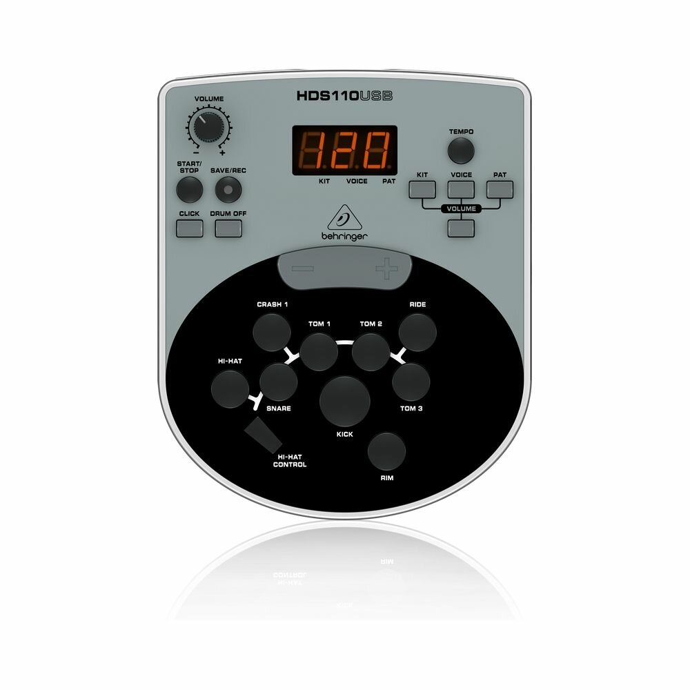 В комплекте: звуковой модуль HDS110USB, педаль бас барабана, пэды и стойки – 1 х 8" двух зонный пэд малого барабана, 3 х 8" пэда томов, 3 х 12" пэда тарелок, хай-хэт триггер педаль, рама с установленными стойками, кабель, барабанные палочки