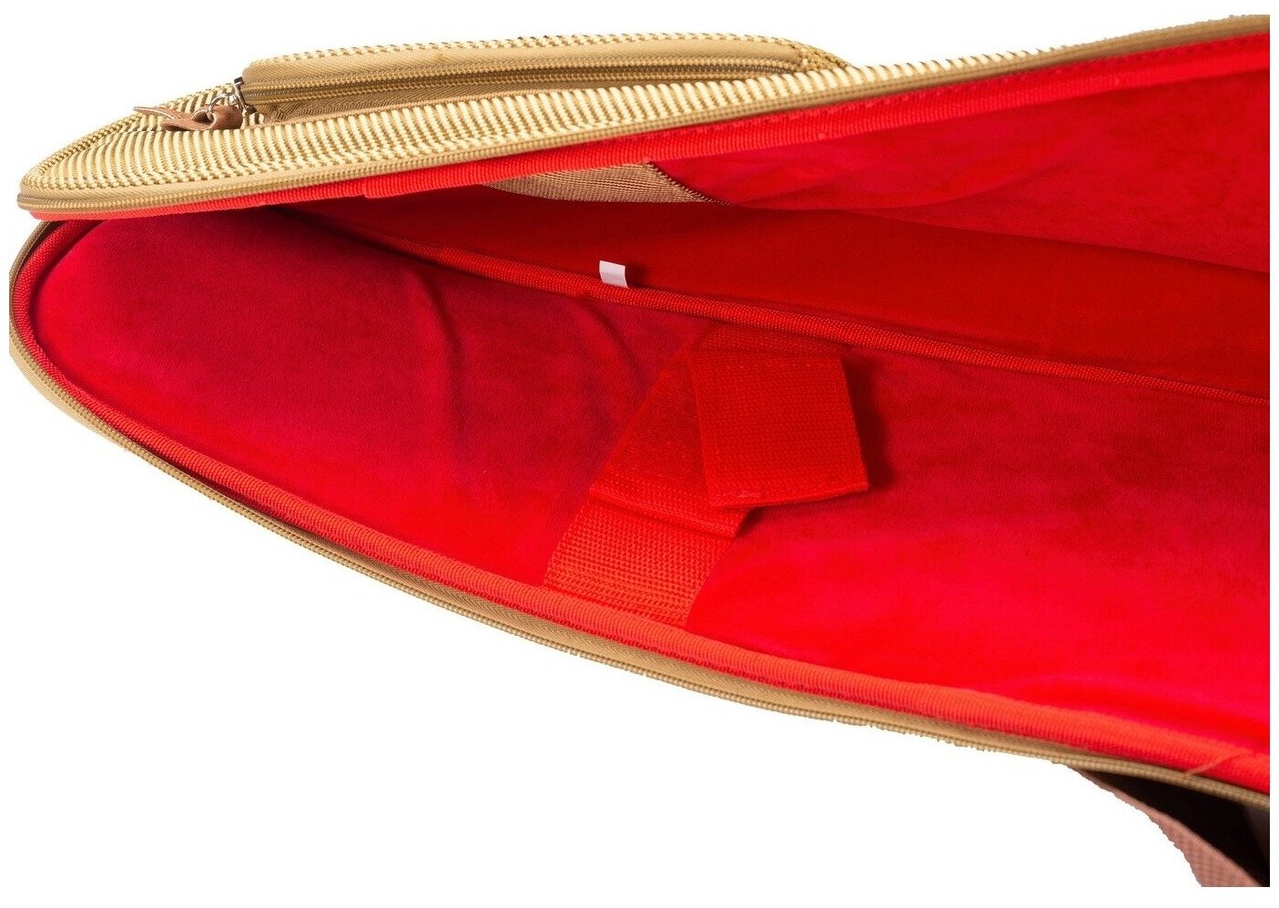 Чехол для акустической гитары. Подойдет для любого типа акустической гитары. Снаружи чехол имеет водоотталкивающее покрытие. Внутренняя часть чехла повторяет форму деки акустический гитары, помогая сохранить инструмент неподвижным во время транспортировки. Снаружи есть вместительный карман для нот и аксессуаров и 3 кармана поменьше. Нести чехол можно в руке за ручку, которая находится на боковой поверхности или при помощи двух синтетических (регулируемых по длине) ремней в виде наплечного рюкзака. Внешние размеры: 1120х445х150 мм, внутренние размеры: 1095х410х130 мм. Дополнительные размеры внутри чехла: ширина верхней части дэки 325 мм, длина дэки 580 мм, ширина грифа 130 мм. Вес 1,3 кг.