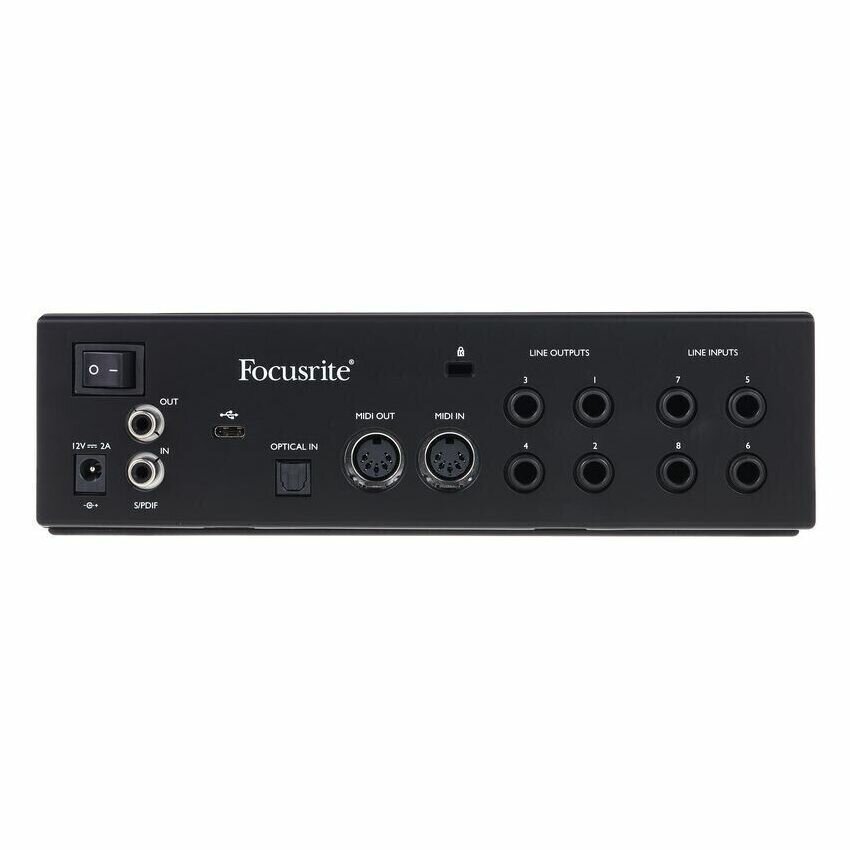 Профессиональный универсальный USB-аудиоинтерфейс c 18 входами и 8 выходами, предназначенный для качественной записи музыки/работы со звуком. Динамический диапазон: 118 дБ (микрофонный, линейный вход, наушники), 116 дБ (инструментальный вход), 124 дБ (линейный выход). Подключение: USB-C. Поддержка операционных систем: Windows, macOS. Вес: 1,61 кг.