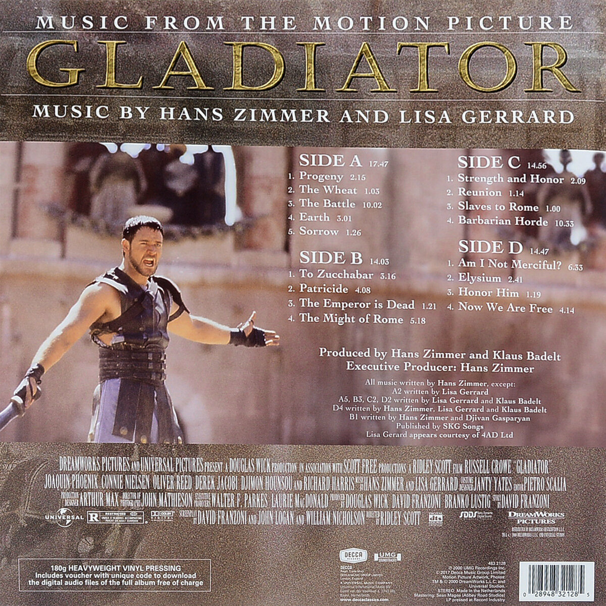 Саундтрек Ханса Циммера и Лизы Джеррард к фильму Гладиатор 2000 года. Саундтрек получил премию Золотой глобус за лучшую музыку к фильму, а также был номинирован на Оскар и BAFTA Awards. Ханс Циммер - немецкий кинокомпозитор, известный своей музыкой к кинофильмам и компьютерным играм. Широко известен благодаря своим эпическим композициям, которые режиссёры успешно используют в боевиках и триллерах. Лауреат премии Оскар, двукратный лауреат премии Золотой глобус, трёхкратный лауреат премии Грэмми. Наиболее известен по музыке к таким фильмам и мультфильмам, как Человек дождя, Король Лев, Спирит: Душа прерий, Скала, Лучше не бывает, Гладиатор, Ангелы и демоны, Пёрл-Харбор, Начало, Интерстеллар и Робот по имени Чаппи, к сериям фильмов Пираты Карибского моря, Тёмный рыцарь, Шерлок Холмс, а также к играм Call Of Duty: Modern Warfare 2, Crysis 2. Лиза Джеррард - австралийский музыкант, вокалистка и композитор, получившая международную известность как участник музыкального коллектива Dead Can Dance. Также известна как кинокомпозитор.