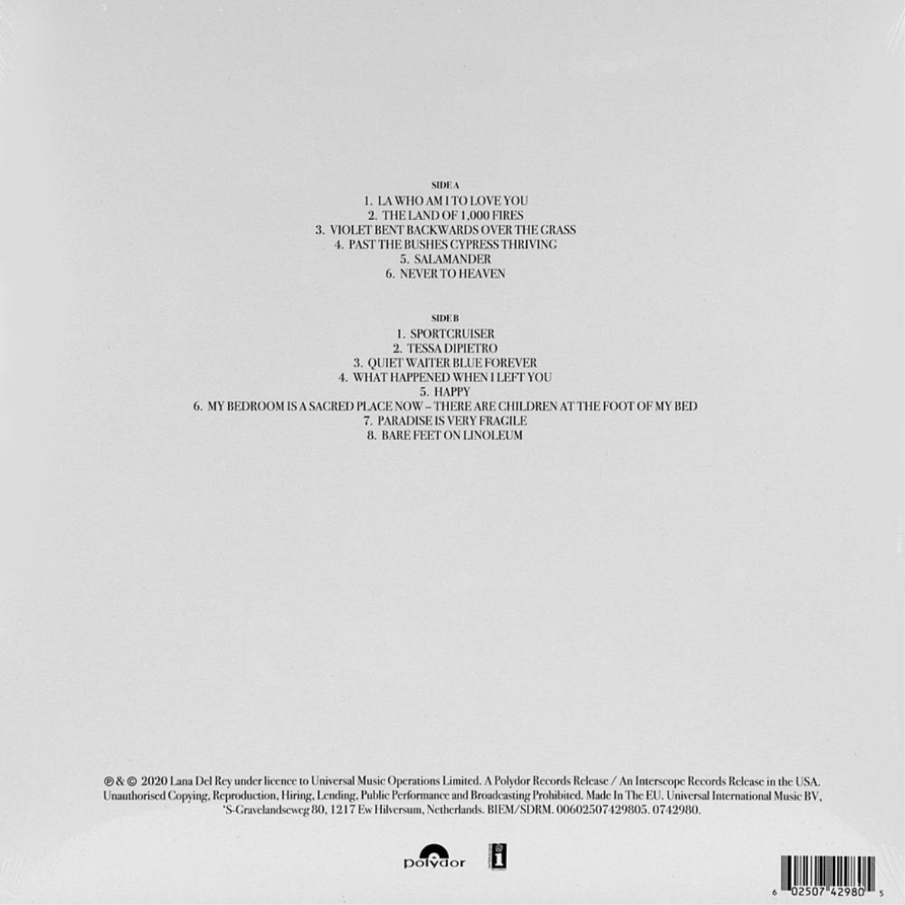 Список треков:A1 L.A. Who Am I To Love You A2 The Land Of 1,000 Fires A3 Violet Bent Backwards Over The Grass A4 Past The Bushes Cypress Thriving A5 Salamander A6 Never To Heaven B1 Sportcruiser B2 Tess Dipietro B3 Quiet Waiter Blue Forever B4 What Happened When I Left You B5 Happy B6 My Bedroom Is A Sacred Place Now - There Are Children At The Foot Of My Bed B7 Paradise Is Very Fragile B8 Bare Feet On Linoleum
