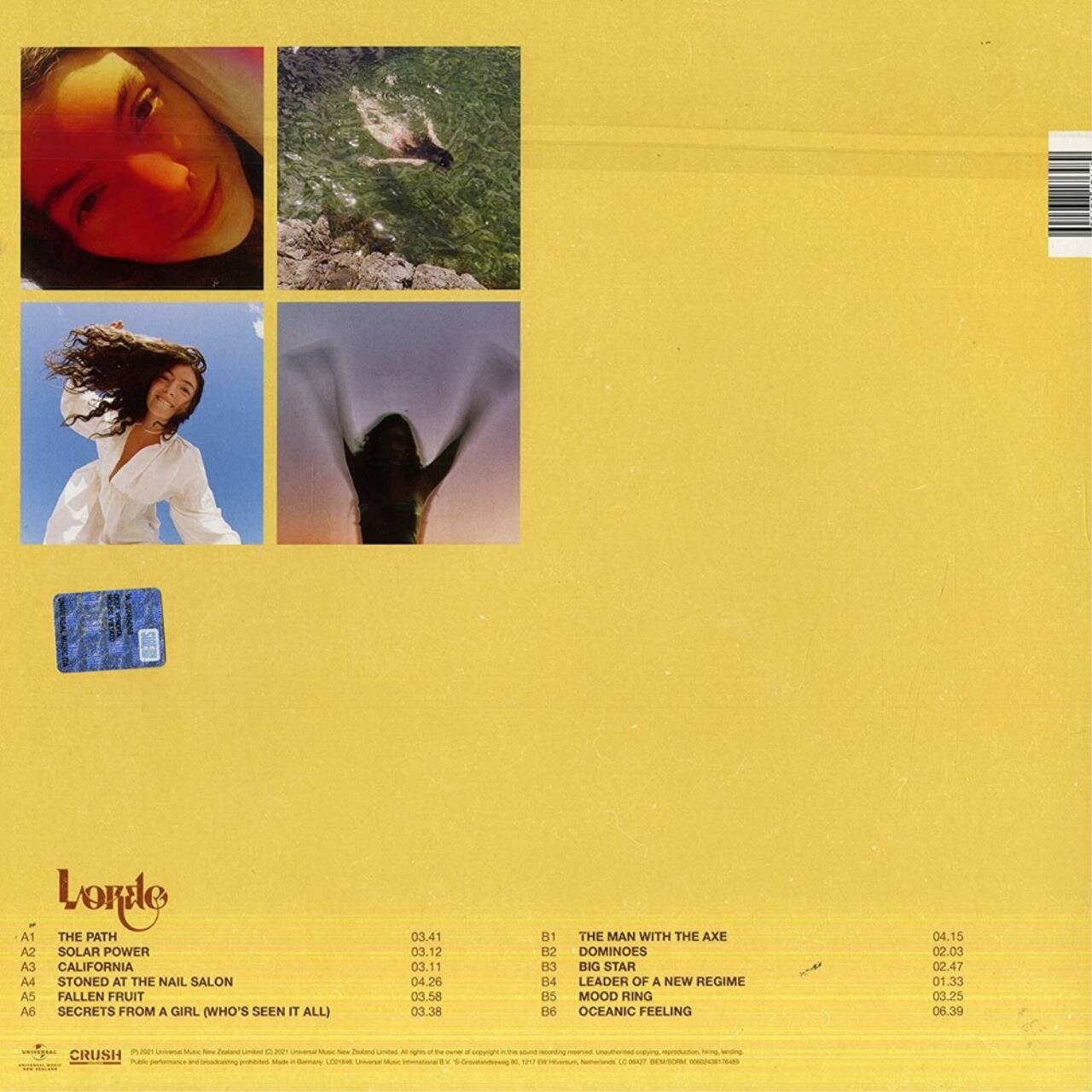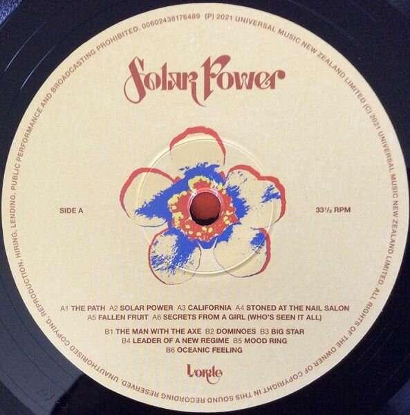 A1. The PathA2. Solar PowerA3. CaliforniaA4. Stoned in the Nail SalonA5. Fallen FruitA6. Secrets From a Girl (Who's Seen It All)B1. The Man with An AxeB2. DominoesB3. Big StarB4. Leader of a New RegimeB5. Mood RingB6. Oceanic Feeling"Solar Power" - третий студийный альбом 2021 года певицы Лорд (Lorde). Релиз представлен на черном виниле. Лорд (настоящее имя Элла Мария Лани Йелич-О’Коннор) - новозеландская певица, автор песен и музыкальный продюсер. Начав карьеру в 2009 году, Элла подписала контракт с лейблом Universal Music Group в подростковом возрасте, а позже начала работу над дебютным альбомом с продюсером Джоэлом Литтлом, который является соавтором большинства песен Лорд. Её первым успехом стал мини-альбом "The Love Club", выпущенный в марте 2013 года и дебютировавший на второй позиции в чартах Австралии и Новой Зеландии. В середине 2013 года Лорд выпустила дебютный сингл "Royals". Песня стала международным кроссовер-хитом и сделала Лорд самой молодой исполнительницей, и единственной новозеландкой, занявшей первую позицию в чарте Billboard Hot 100 с 1987 года. В конце 2013 года, Лорд выпустила свой дебютный студийный альбом "Pure Heroine". Диск возглавил чарты Новой Зеландии и Австралии, также достигнув третьей позиции в американском чарте Billboard 200. В поддержку альбома были выпущены синглы "Tennis Court", "Team", "No Better" и "Glory and Gore". В 2014 году Лорд записала песню "Yellow Flicker Beat", которая была выпущена в качестве сингла к саундтреку "Голодные игры: Сойка-пересмешница. Часть 1". В июне 2017 года состоялся релиз второго студийного альбома Лорд, "Melodrama". Пластинка является самым высокооценённым критиками альбомом исполнительницы на 2017 год. В поддержку диска были выпущены такие синглы, как "Green Light" и "Perfect Places". Композиции Лорд записаны в дрим-поп и инди-электроника. Исполнительница имеет две премии Грэмми, одну BRIT Awards и десять премий New Zealand Music Awards.