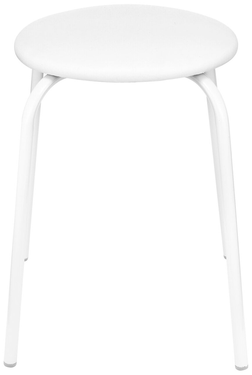 Это классический табурет в современной белой расцветке на надежном крепком металлическом каркасе. Это недорогое и практичное решение для дома, офиса и даже выездных пикников.