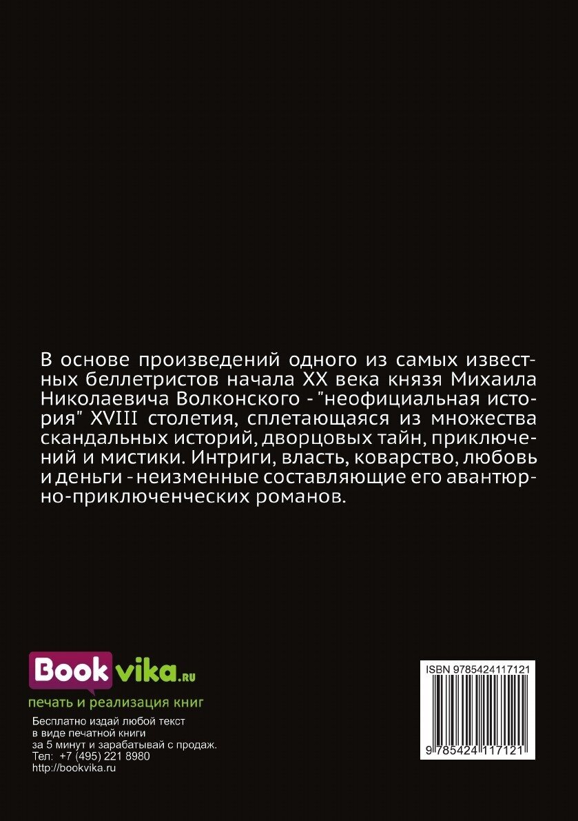 В основе произведений одного из самых известных беллетристов начала ХХ века князя Михаила Николаевича Волконского - "неофициальная история" XVIII столетия, сплетающаяся из множества скандальных историй, дворцовых тайн, приключений и мистики. Интриги, власть, коварство, любовь и деньги - неизменные составляющие его авантюрно-приключенческих романов.