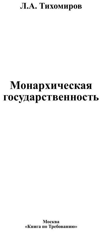 "Монархическая государственность" Л. А. Тихомирова - труд совершенно уникальный в отечественной социально-политической мысли, труд доселе никем не превзойденный. Даже противники монархии называли его "лучшим обоснованием идеи самодержавной монархии". Автор глубоко и подробно исследует историю монархического принципа и теоретически выстраивает систему истинной, самодержавной монархии.