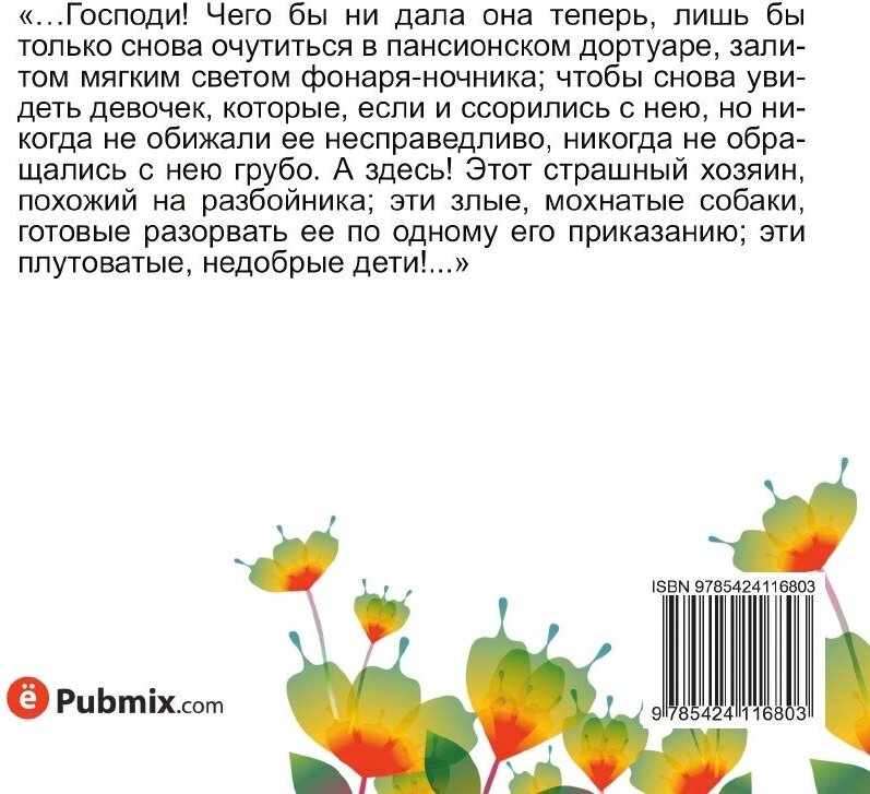 «…Господи! Чего бы ни дала она теперь, лишь бы только снова очутиться в пансионском дортуаре, залитом мягким светом фонаря-ночника; чтобы снова увидеть девочек, которые, если и ссорились с нею, но никогда не обижали ее несправедливо, никогда не обращались с нею грубо. А здесь! Этот страшный хозяин, похожий на разбойника; эти злые, мохнатые собаки, готовые разорвать ее по одному его приказанию; эти плутоватые, недобрые дети!...»