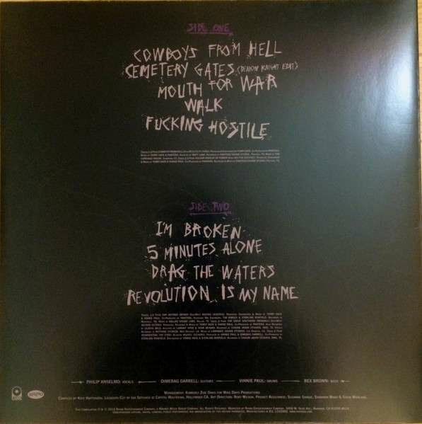 SIDE A: 1. Cowboys From Hell 2. Cemetery Gates (Demon Knight Edit) 3. Mouth For War 4. Walk 5. Fucking Hostile. SIDE B: 6. I'm Broken 7. 5 Minutes Alone 8. Drag The Waters 9. Revolution Is My Name.