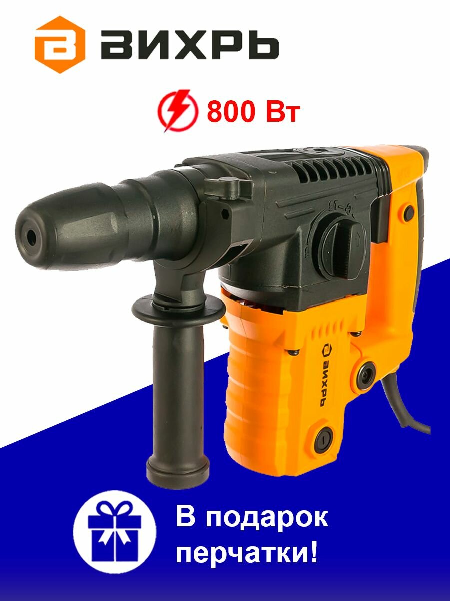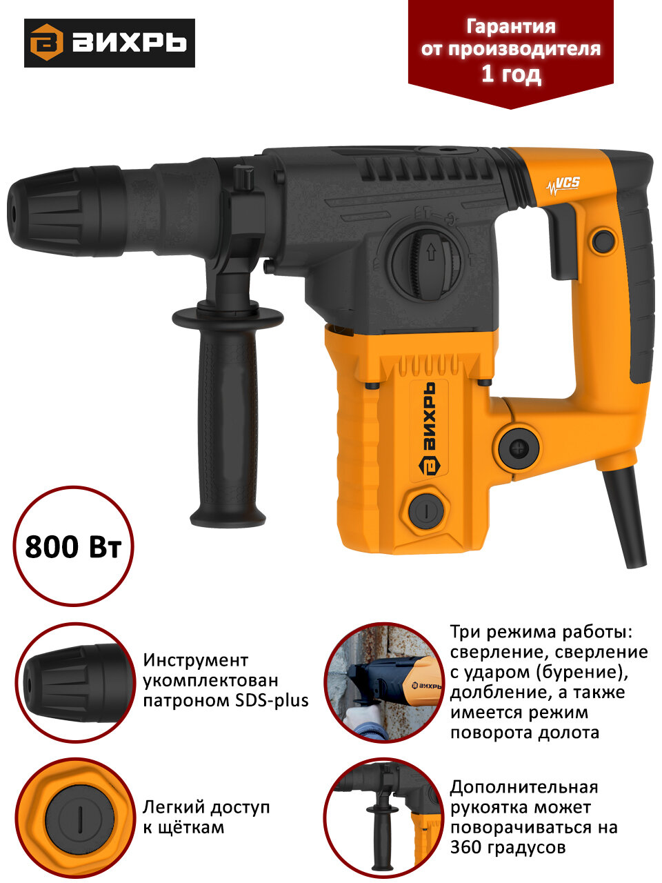 Перфоратор Вихрь отличается от ударной дрели значительно большей силой удара, за счет чего сфера применения инструмента значительно шире. Данная модель комплектуется ограничителем глубины и дополнительной рукояткой. Мощность перфоратора Вихрь составляет 800 Вт.