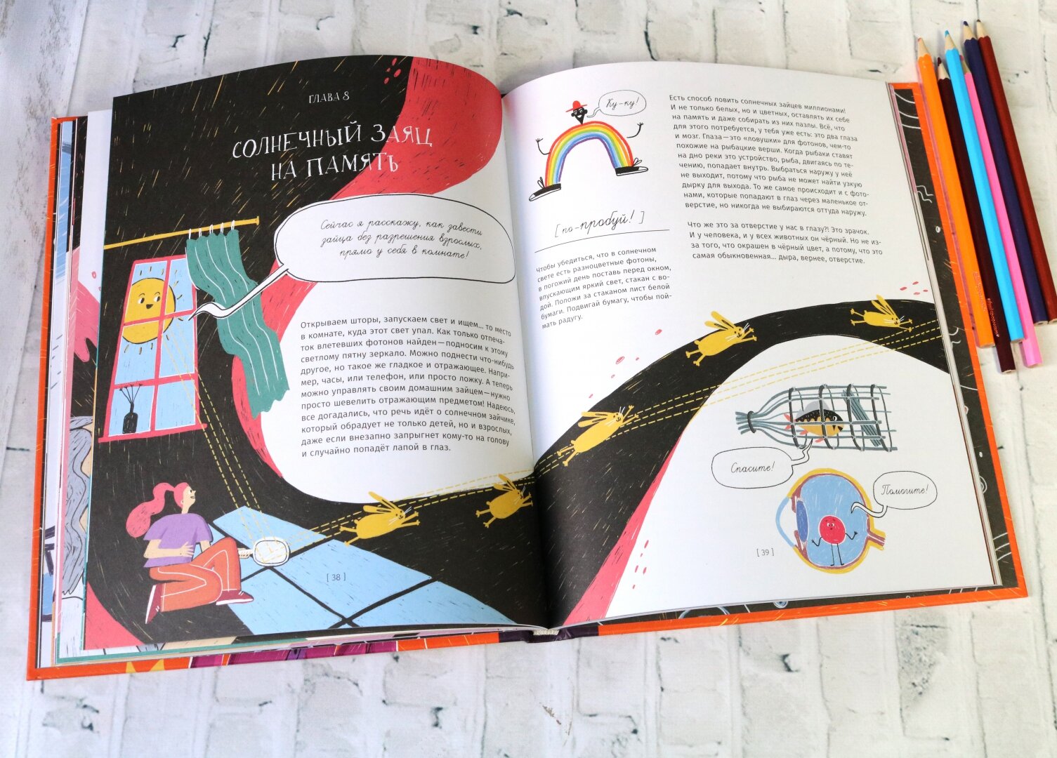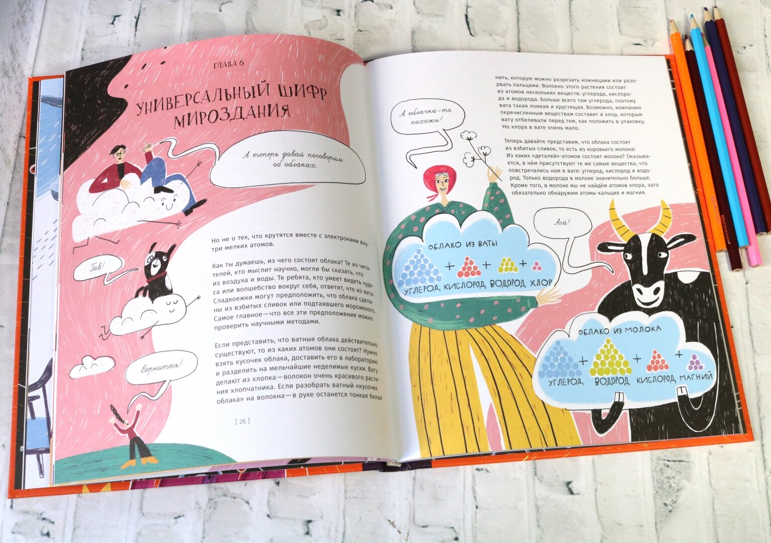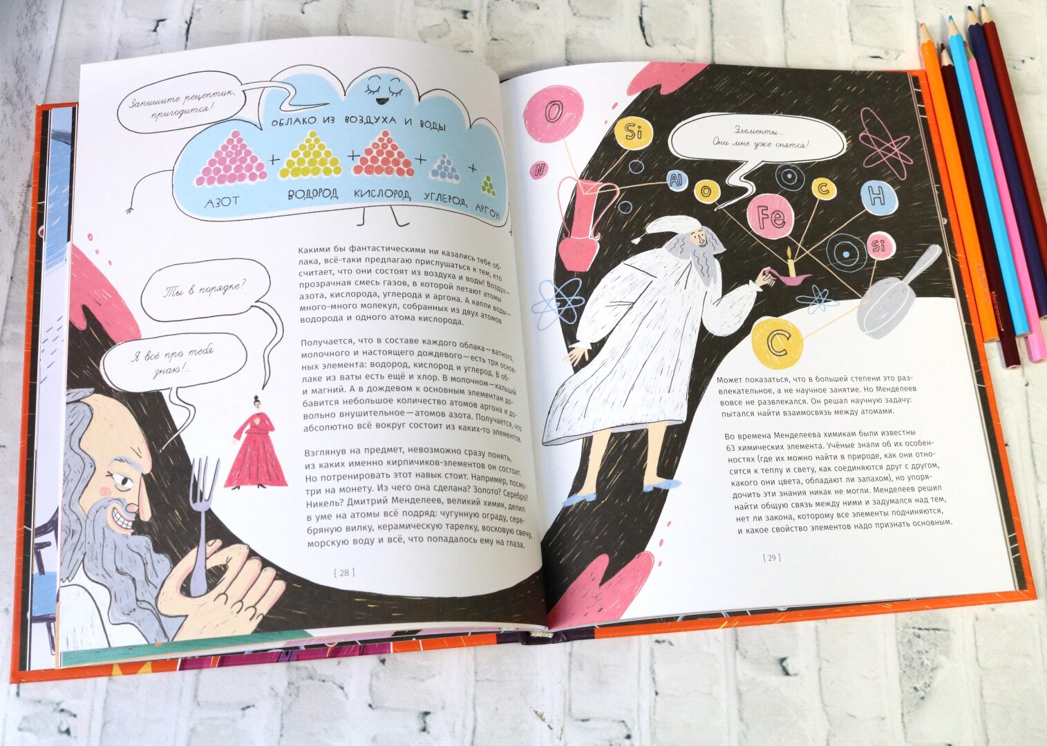В книге много иллюстраций, красивых и забавных. Одна таблица Менделеева чего стоит. Также плюс этой книги, пожалуй, в том, что ее содержание помогает разобраться, как устроен организм человека и как ему удается взаимодействовать с окружающей средой. Кроме законов физики и химии рассказывает детям о человеческой анатомии.