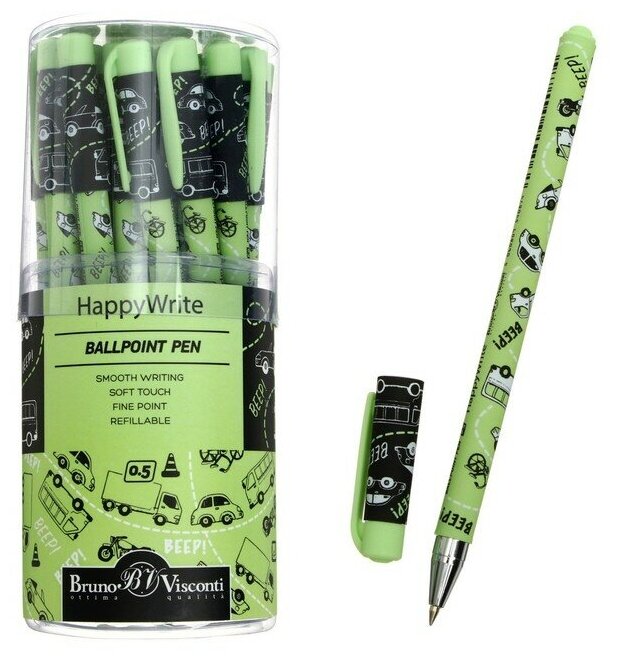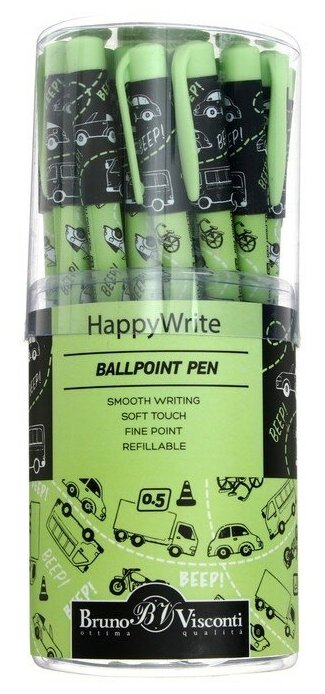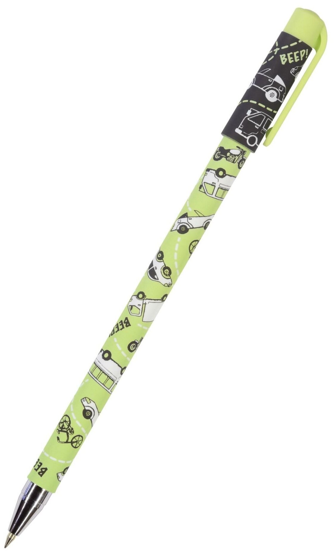 Синяя шариковая ручка из коллекции "Happy Write. Машинки". Паттерн изображает интенсивное дорожное движение: на оливковом фоне распределены автобусы, машинки, автомобили, велосипеды, надпись "Beep" и дорожная разметка. Корпус выполнен из качественного пластика с мягким нескользящим резиновым напылением "Silk Touch". Надежно удерживается в руке и не скользит, несмотря на отсутствие грипа. Ручка закрывается колпачком контрастного цвета с клипом, что позволяет закрепить ручку в пенале или на тетради. Стержень длиной 140 мм заполнен пигментными чернилами от немецкого производителя "Dokumental". Пишет тонко и четко, образуя линии толщиной 0,38 мм.