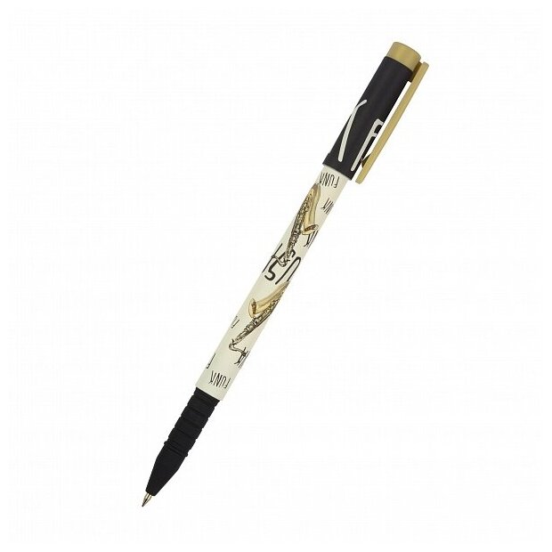 Простая и красивая шариковая ручка из коллекции "Fun Write. Музыка". Изысканный дизайн в бело-золотой гамме с изображением саксофонов и надписей "Funk" притягивает внимание. Ручка приятная и комфортная для длительного письма. Пластиковый корпус покрыт мягким, нескользящим резиновым напылением "Silk Touch". Есть грип для максимального контроля и удобства. Качественные чернила синего цвета от немецкого производителя "Dokumental" обеспечивают четкость и однородность линий. Стержень сменный. Толщина линии при письме 0,38 мм, так что ручка подойдет любителям тонкого и аккуратного письма.