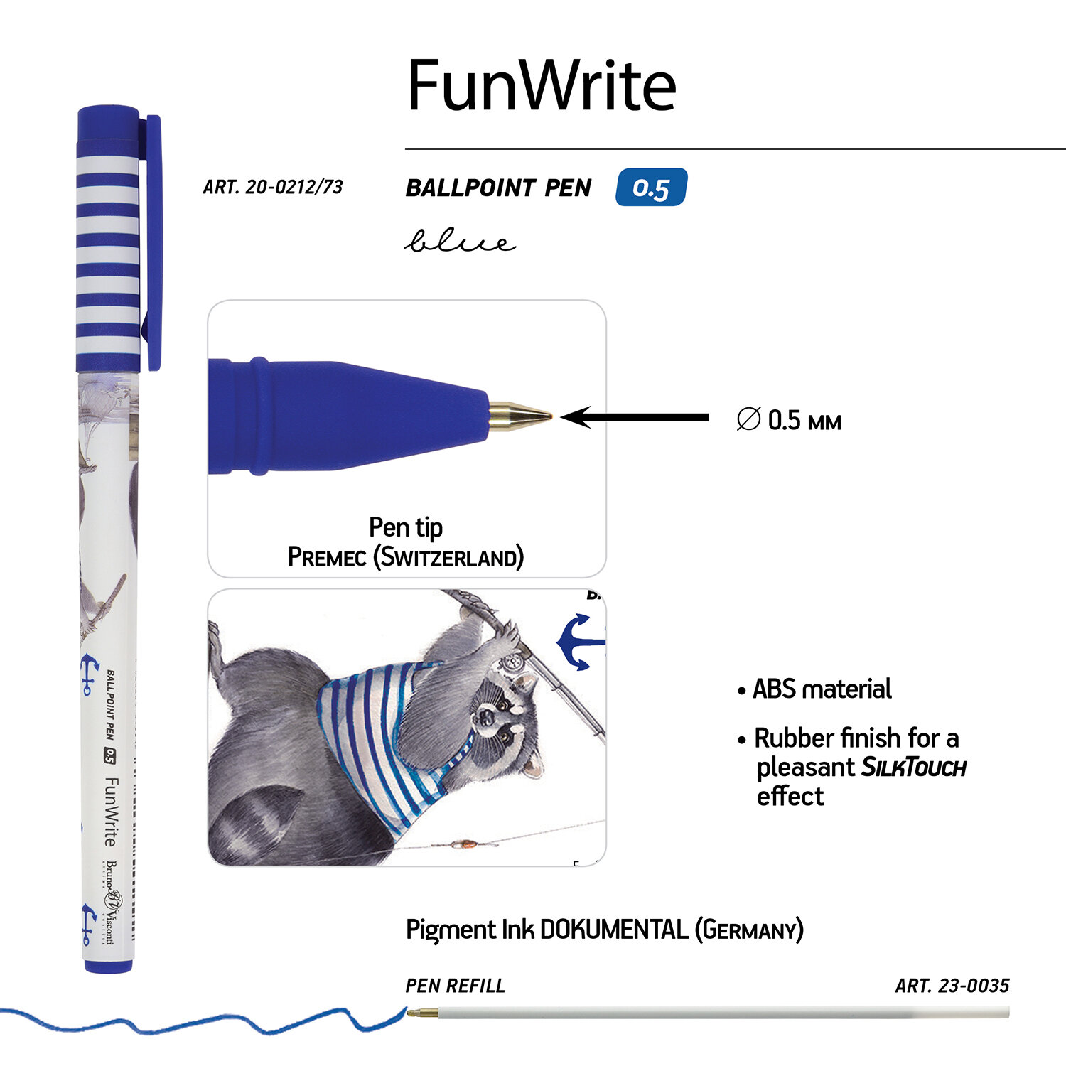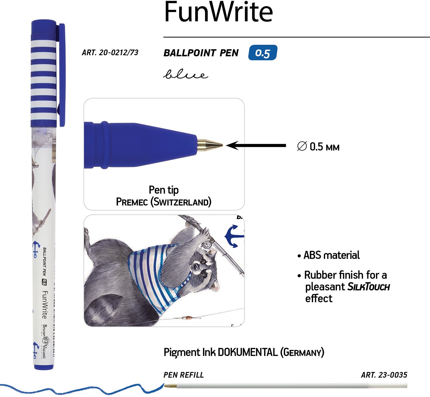Синяя шариковая ручка с изображением енота в тельняшке и с удочкой из серии "Fun Write". Выполнена из пластика, с высококачественной печатью принта. Корпус покрыт тактильно приятным нескользящим резиновым напылением "Silk Touch". Ручка закрывается колпачком с пластиковым клипом, что позволяет закрепить ее в пенале или ежедневнике. Стержень заполнен пигментными чернилами "Dokumental". Они не растекаются и помогают создавать четкие линии при письме. Ручка пишет мягко и тонко: толщина линии 0,38 мм.