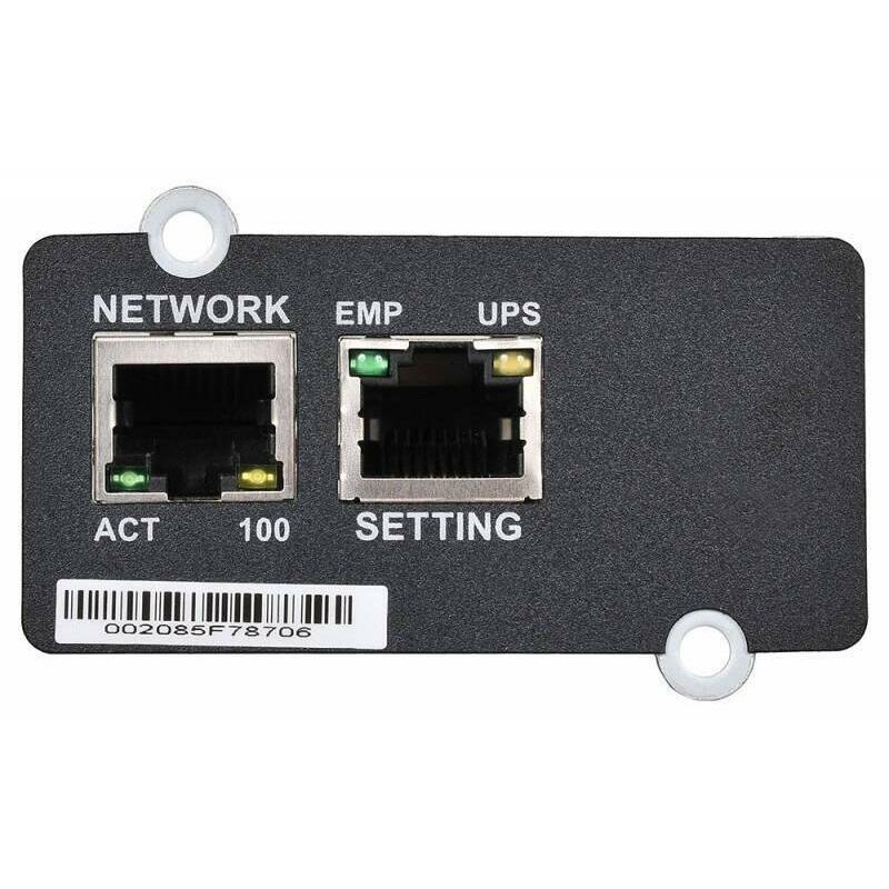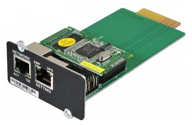 SNMP карта предназначена для сбора информации и управления источником бесперебойного питания по сетевому протоколу SNMP. Позволяет использовать SMNP-менеджеры или обычный веб-браузер для просмотра текущего состояния ИБП, установки его параметров, в том числе задание программы отключения ИБП при различных событиях: пропадании напряжения в питающей сети, разряд батареи, перегрузка или перегрев ИБП, плановое выключение