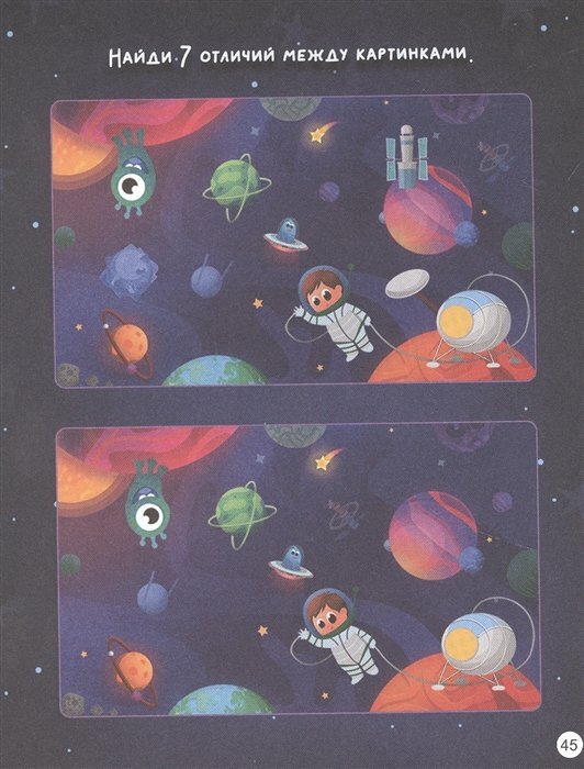 Вместе с планетами, звездами и пришельцами выполнять задания и раскрашивать картинки так весело! Благодаря удобному формату и твердой подложке активити-блокнот удобно брать в дорогу. Проходите лабиринты, отгадывайте загадки, ищите отличия между картинками — время пролетит незаметно!