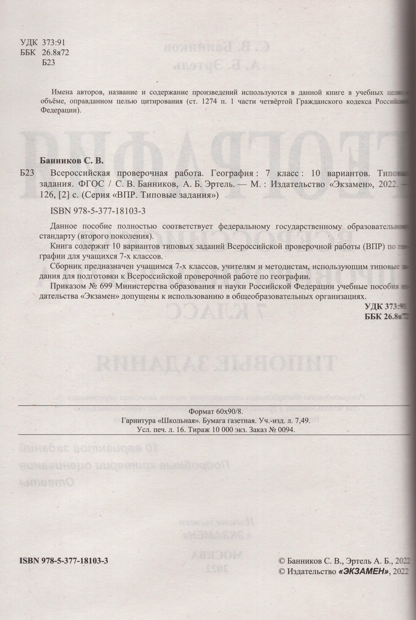 География Всероссийская проверочная работа 7 класс Типовые задания 10 вариантов заданий (Эртель Анна Борисовна; Банников Сергей Валерьевич); Экзамен, 2022