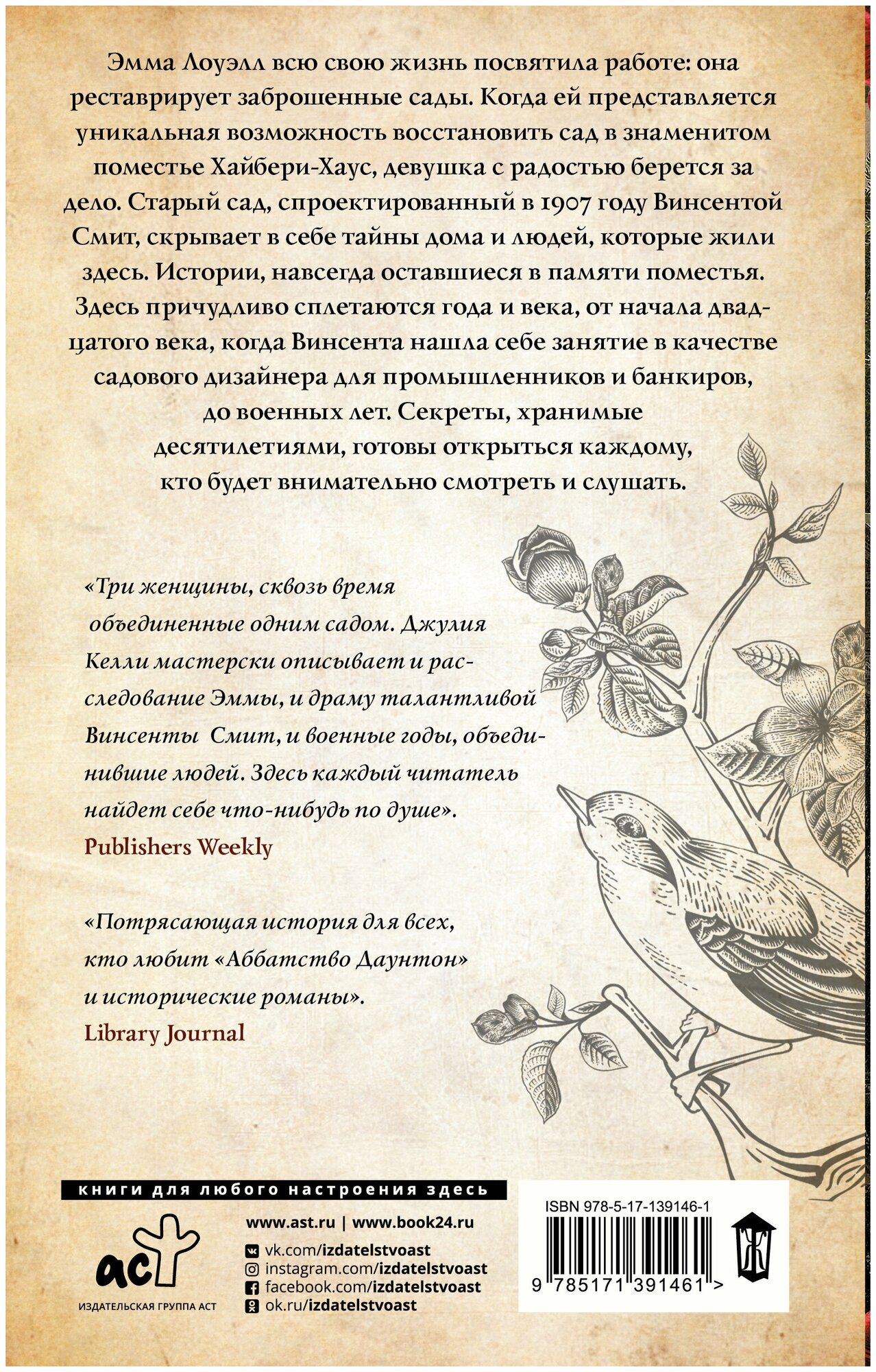 Винсента Смит, Элизабет Пэдли и Эмма Лоуэлл-все они связаны со знаменитым садом поместья Хайбери-Хаус. Винсента проэктирует его в 1907 году, Элизабет работает в поместье, превращенном в военный госпиталь в 1944-м,а Эмма восстанавливает некогда известный сад в наше время. Автор погружает нас в атмосферу чопорной Англии начала века, в тревожные годы войны, и в современность. Разные времена, разные нравы и события, но неизменным остается тяга людей к прекрасному и желание быть счастливыми! Все героини романа находят свою любовь, свое место в жизни. И все это на фоне замечательного, даже таинственного сада! Много событий происходят здесь... Истинные любители хорошей литературы получат большое удовольствие от прочтения книги.