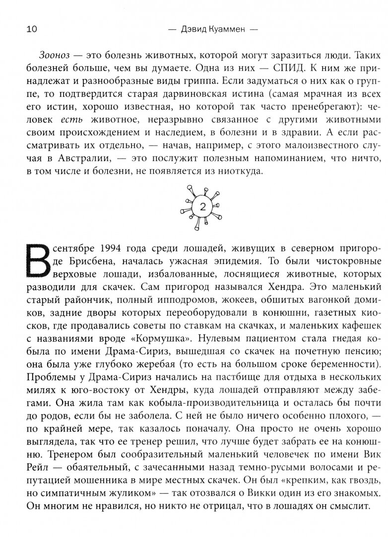 Автор погружает своих читателей в мир свирепых инфекции и человеческих судеб, где болезнь может проноситься вихрем или долго мучать свою очередную жертву. Из книги мы узнаем о вирусе Хендра, который мало затрагивают популяризаторы вирусологии, на страницах переводных книг, так и отечественные специалисты. Далее много информации посвящено вирусу Эбола, его возникновению, вариантам, идентификации и погони учёных за ним для выявления путей передачи и локализации вспышек заболевания и распространения по территории. Следующий шаг автора это погружение нас в мир простейших, а точнее в мир заболевания под названием малярия. Затем рассказ о коронавирусе вызывающем ТОРС. Далее повествование о лихорадке Ку, пситаккозе, и болезни Лайма, вирусе Марбурга, ну и куда же без ВИЧ-1, ВИЧ-2 и гриппа. Много интересных историй, путешествий самого автора к местам инфекций и рассказы учёных противостоящих заболеваниям полевых вирусологов, собирающих образцы биологических жидкостей у животных и пытающихся найти источники очередных вспышек в разных уголках планеты.