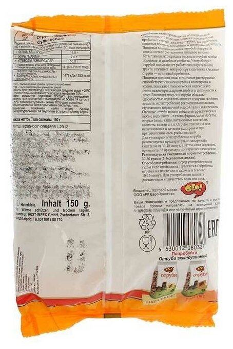Описание товара:Овсяные отруби — это источник нерастворимых пищевых волокон, который получают из оболочки зерен овса. Пищевые волокна, как губка впитывают токсины, отравляющие организм, помогают выводит шлаки, снижают аппетит и тем самым снижают вес. Кроме этого отруби являются источником антиоксидантов, белка, магния, витаминов группы B и РР. Отруби особенно полезны при ожирении, диабете и нарушении обмена веществ. При регулярном употреблении отрубей в пищу заметно улучшается фигура и настроение. Рассыпчатые отруби гармонично сочетаются с кисломолочными продуктами. Смешайте их и получится отличный, сытный и полезный перекус. Добавляйте отруби в салаты, супы или второе блюдо. Отруби не имеют специфического яркого аромата, поэтому будут незаметны в блюде и не повлияют на вкус, но при этом добавят пользы.Состав товара:Отруби овсяные.Способ приготовления:Рекомендуем употреблять продукт в сухом виде или с молоком, кефиром, йогуртом, соком. Порция продукта 50-60 грамм (5-6 столовых ложек).