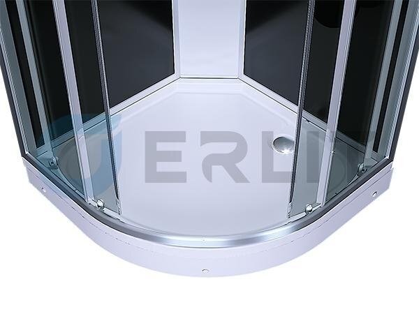 задняя стенка - черная, дверцы - тонированные. Тип душевая кабина. Толщина стекла 4 мм. Форма 1/4 круга. Крыша есть. Задняя стенка стекло. Поддон 17 см. Профиль алюм. серебро. Центральная стойка серебро, пластик. тропический душ, ручной душ, зеркало, полочка. Габариты 80*80*215 см