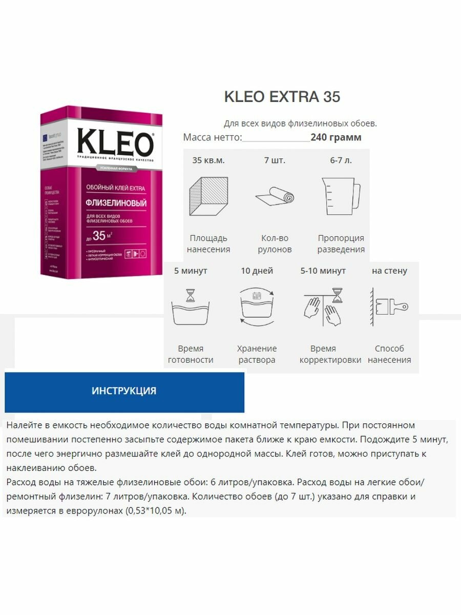клей для обоев kleo extra 55 /флизелиновый/ 030 EXTRA 55