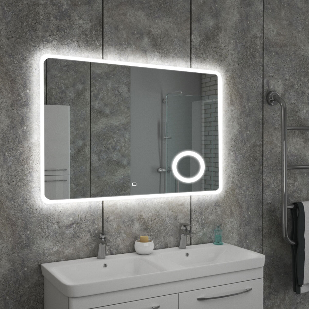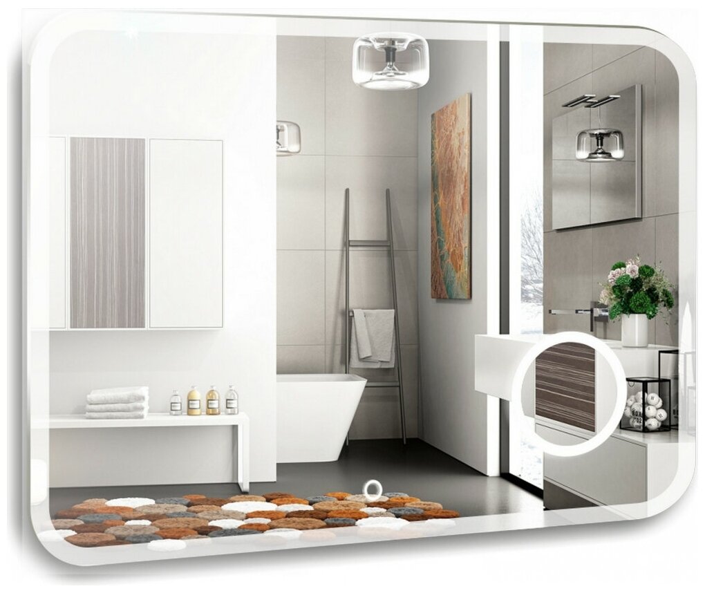 Настенное зеркало для ванной Mixline с подсветкой 80 х 55 см изготовлено из зеркального полотна толщиной 4 мм. Оснащено сенсорным выключателем и диммером, который при удержании пальца на сенсоре позволяет менять интенсивность освещения. Свет белый 6000К. На зеркале имеется стекло с четырехкратным увеличением. Его размер составляет 135 мм, площадь подсветки вокруг объектива составляет 15 мм. Все электрические компоненты размещены внутри корпуса из Abs-пластика, который защищает от влаги и механических повреждений. В качестве элемента подсветки используется светодиодная лента, которая обеспечивает яркое свечение по периметру зеркала. Срок службы диодов - 100 000 часов. Зеркало влагостойкое и защищено от попадания случайных брызг и капель воды. Комплектация: крепеж, инструкция.