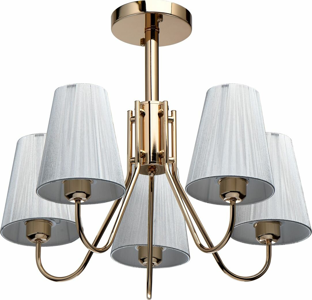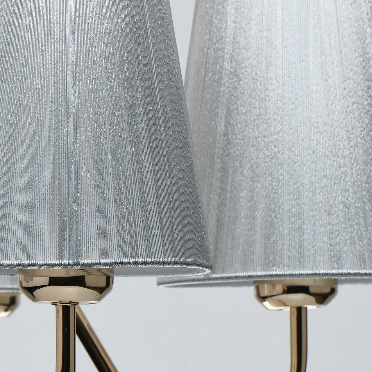 Оригинальное сочетание цвета золота основания и серебряного цвета абажуров.Абажур увеличен в высоту, создает современный облик освещения.Компактная высота для стандартных помещений.