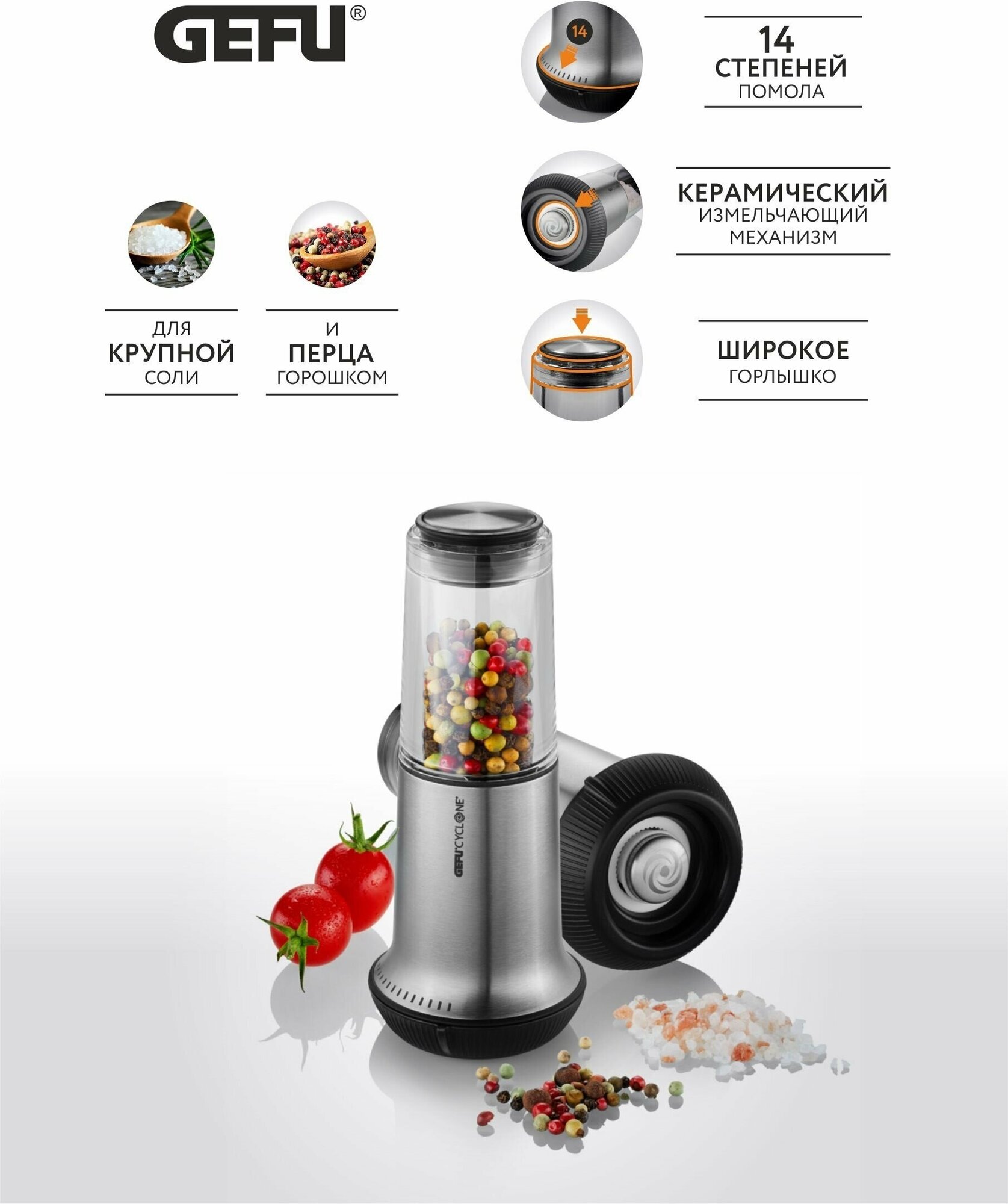 Инновационная мельница X-PLOSION® сочетает в себе современный дизайн, передовые технологии и немецкое качество. Оснащенный уникальным измельчающим механизмом CYCLONE®, он перемалывает кристаллы соли и перца исключительно быстро, легко и эффективно, производя идеальный уровень измельчения - от экстра-тонкого до очень грубого. X-PLOSION® всегда раскрывает полный, натуральный вкус перца и соли, от приготовления до приправы. Дизайнерская серия от GEFU X-PLOSION® устанавливает новые стандарты измельчения специй благодаря продуманным мельницам, сверхострым измельчителям для перца чили, стильным шейкерам и другим интеллектуальным инновационным товарам. Продукция серии X-PLOSION® выглядит эффектно, удобно помещается в руке и обладает превосходным набором функций. X-PLOSION®: сила свежего вкуса и аромата для современной творческой кухни. Все мельницы X-PLOSION® оснащены инновационным измельчающим механизмом CYCLONE®, который измельчает кристаллы соли и перца быстро, легко и эффективно.