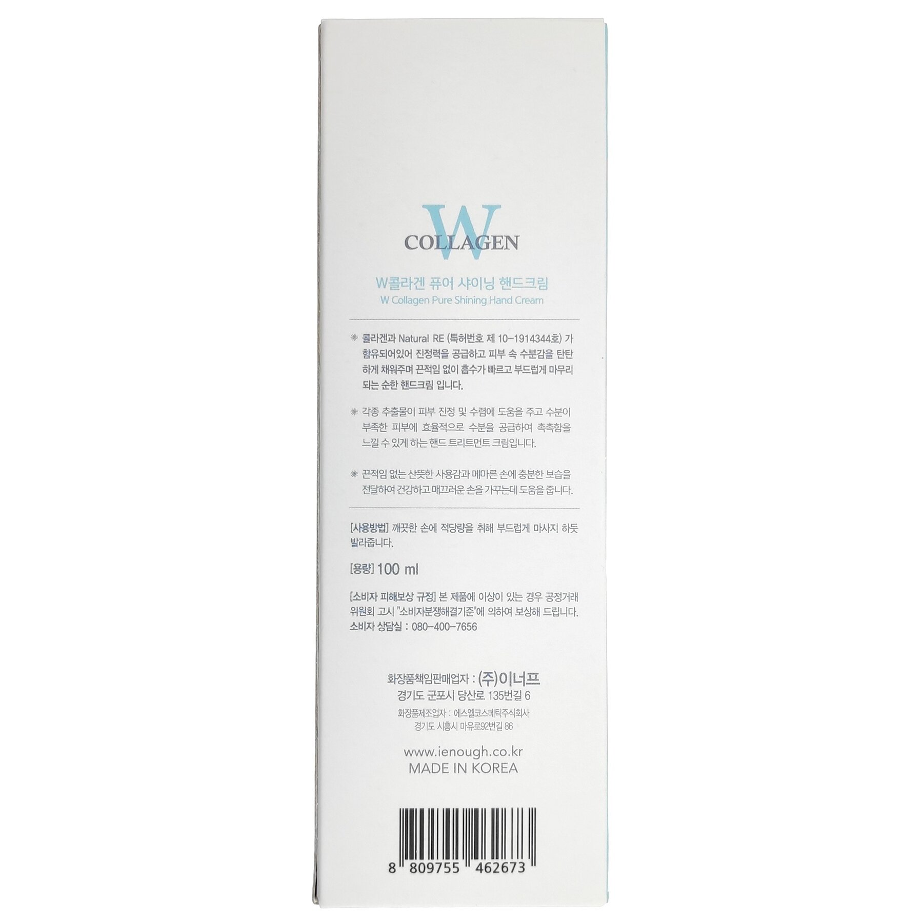 Enough W Collagen Pure Shining Hand Cream — увлажняющий и смягчающий крем для рук с гидролизованным коллагеном, избавляющий от нежелательной пигментации. W Collagen – гидролизованный морской коллаген, который стимулирует выработку собственного коллагена, обеспечивает увлажнение и укрепление кожи, помогает быстрой регенерации клеток кожи. Также крем обладает отличным отбеливающим эффектом, очищая нежелательную пигментацию с рук.