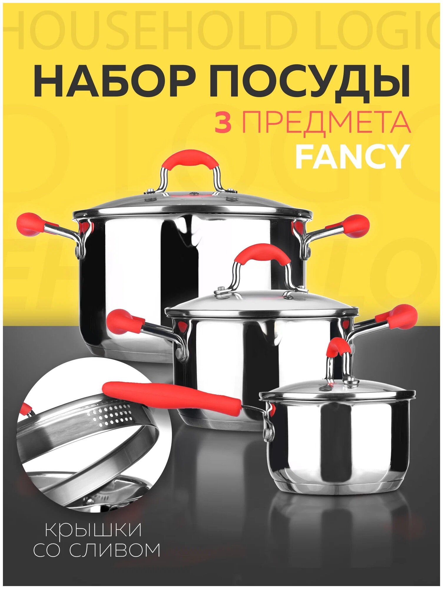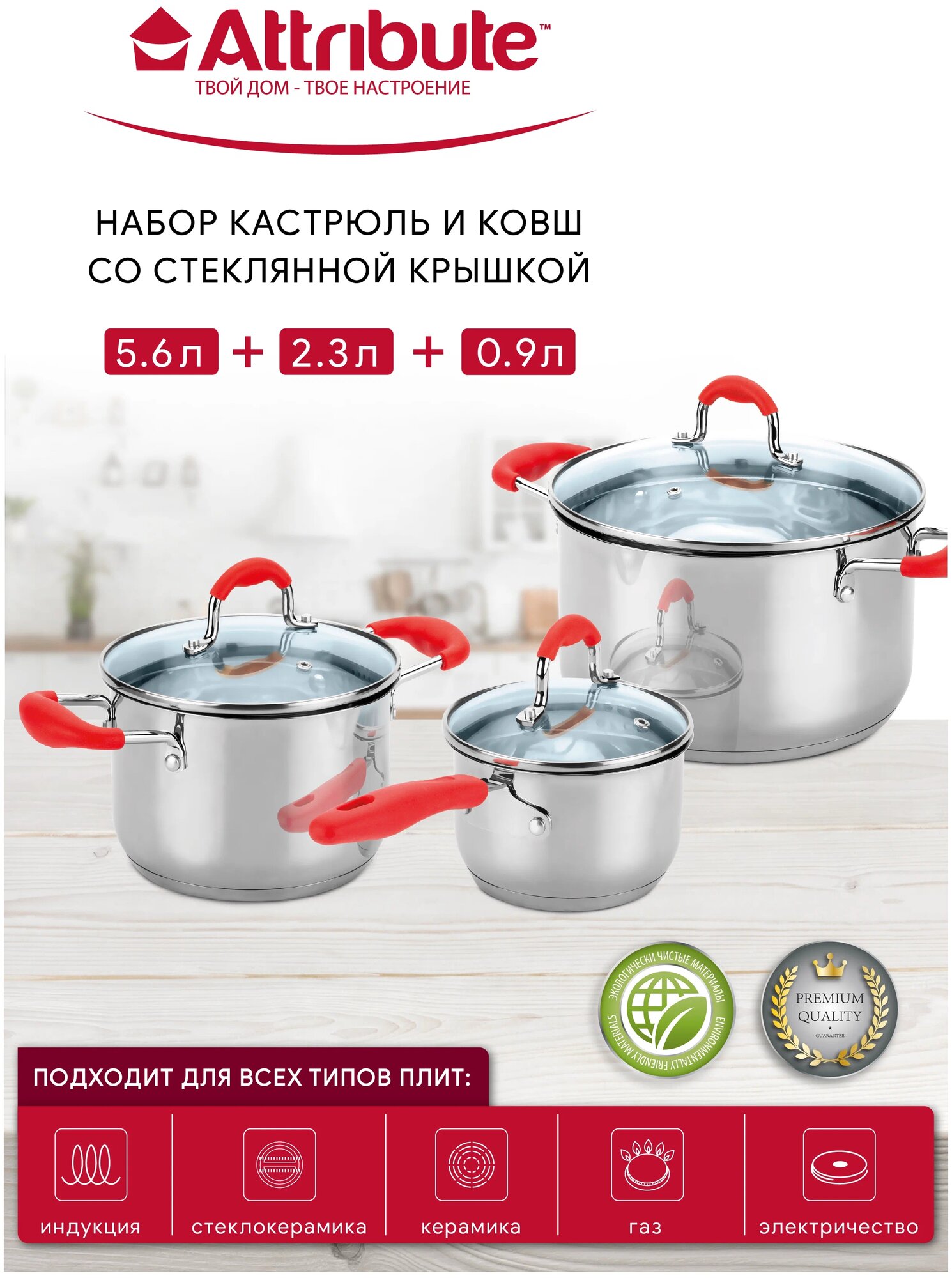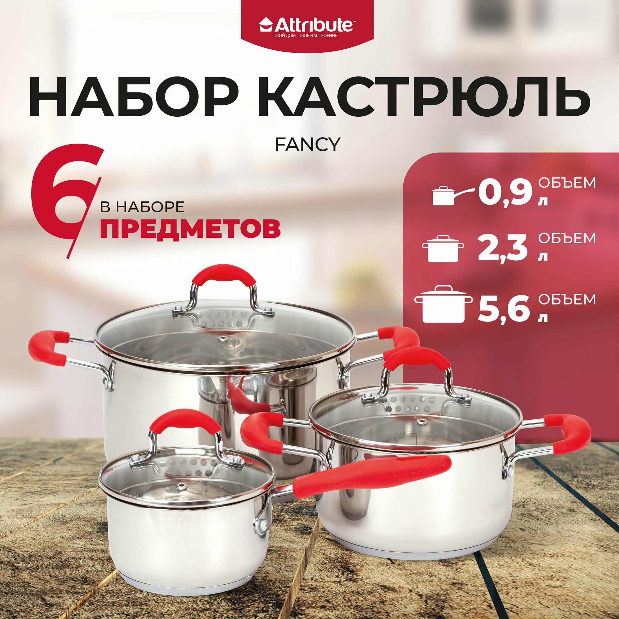 Набор посуды из нержавеющей стали FANCY 6 предметов. В состав набора входит две кастрюли со стеклянными крышками объемами 5,6 л и 2,3 л, а также ковш объемом 0,9 л. Две перфорации на крышке превращают ее в дуршлаг, что помогает сливать только жидкость. Эргономичные ручки из силикона не скользят и не нагреваются. Посуда подходит для любых типов плит, включая индукционные